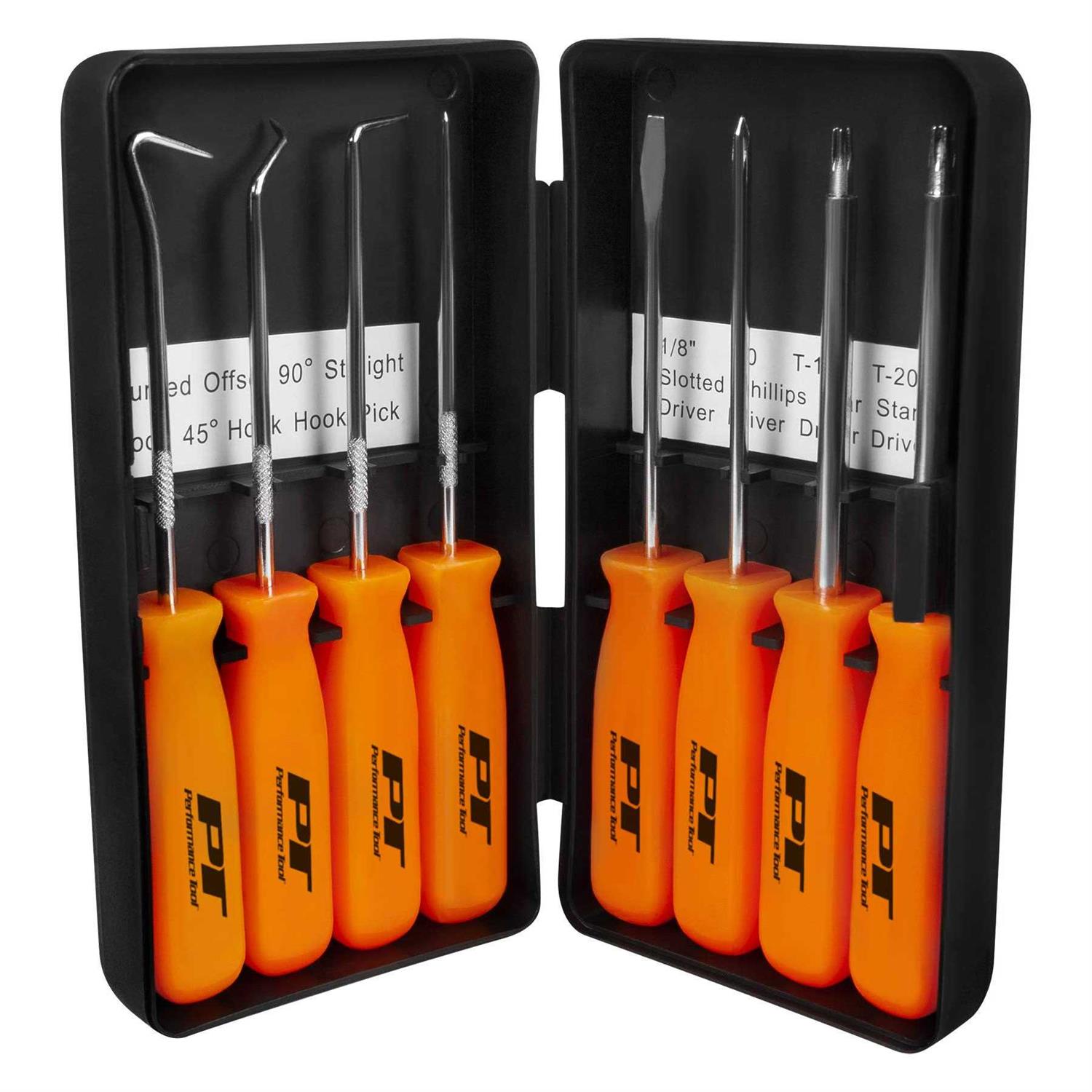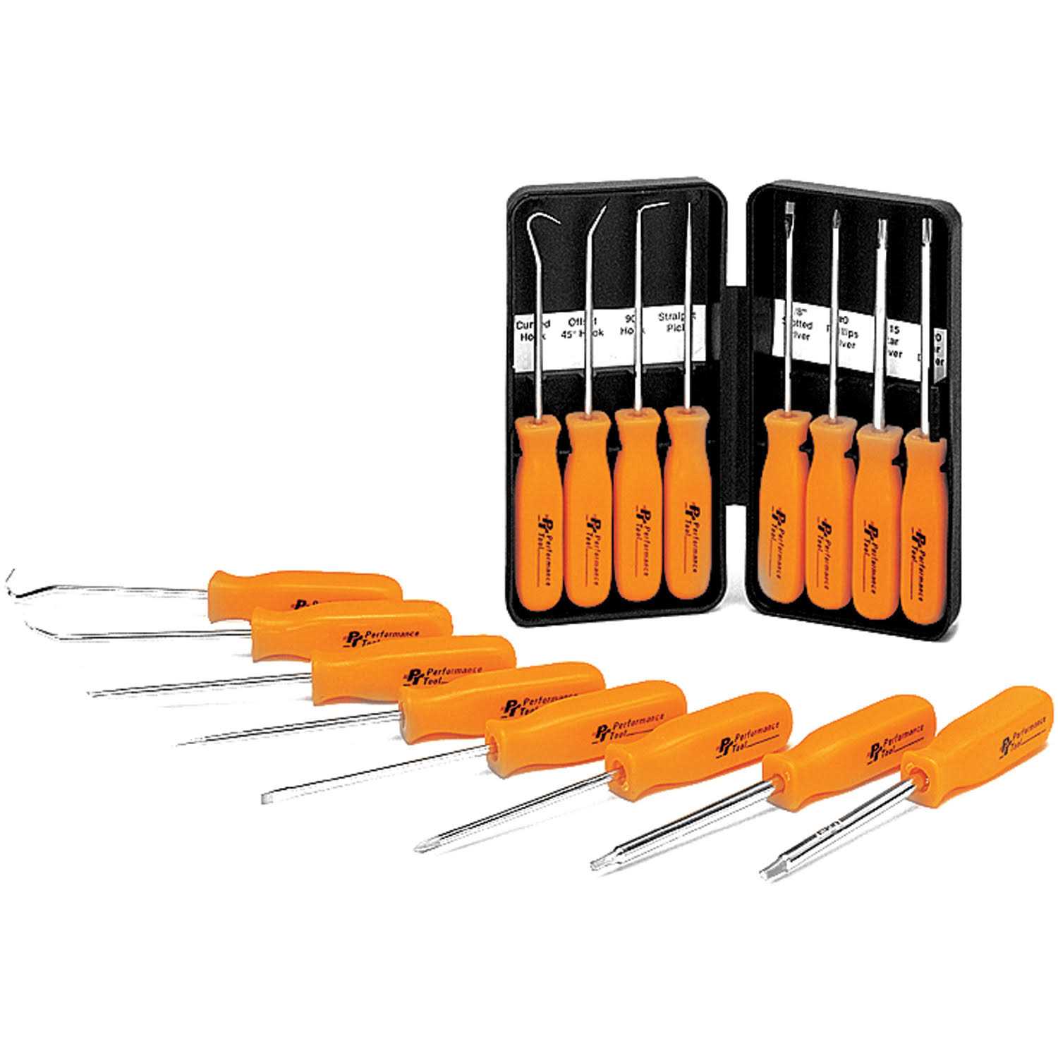 Additional Information Chrome vanadium steel shafts with magnetic tips. High visibility PVC handles. Contains curved hook, 90 degree hook, offset 45 degree hook, 1/8″ slotted screwdriver, #0 Phillips screwdriver, straight pick, T15 star driver, T20 star driver.