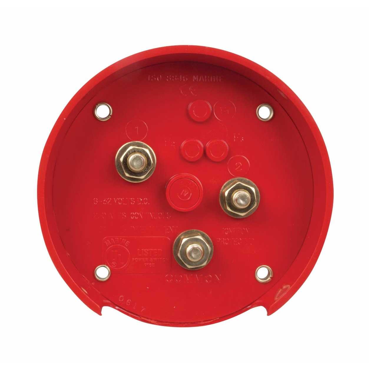 Featuring a make-before-break design, this Perko switch permits selection between two batteries for starting and charging or operation of both batteries in parallel. The “off” position also acts as an emergency disconnect in the event of an electrical problem. For use with systems under 50 volts. Rated 250 amps continuous, 360 amps intermittent. Dimensions: 5-1/4 inch diameter x 2-5/8 inch height.
