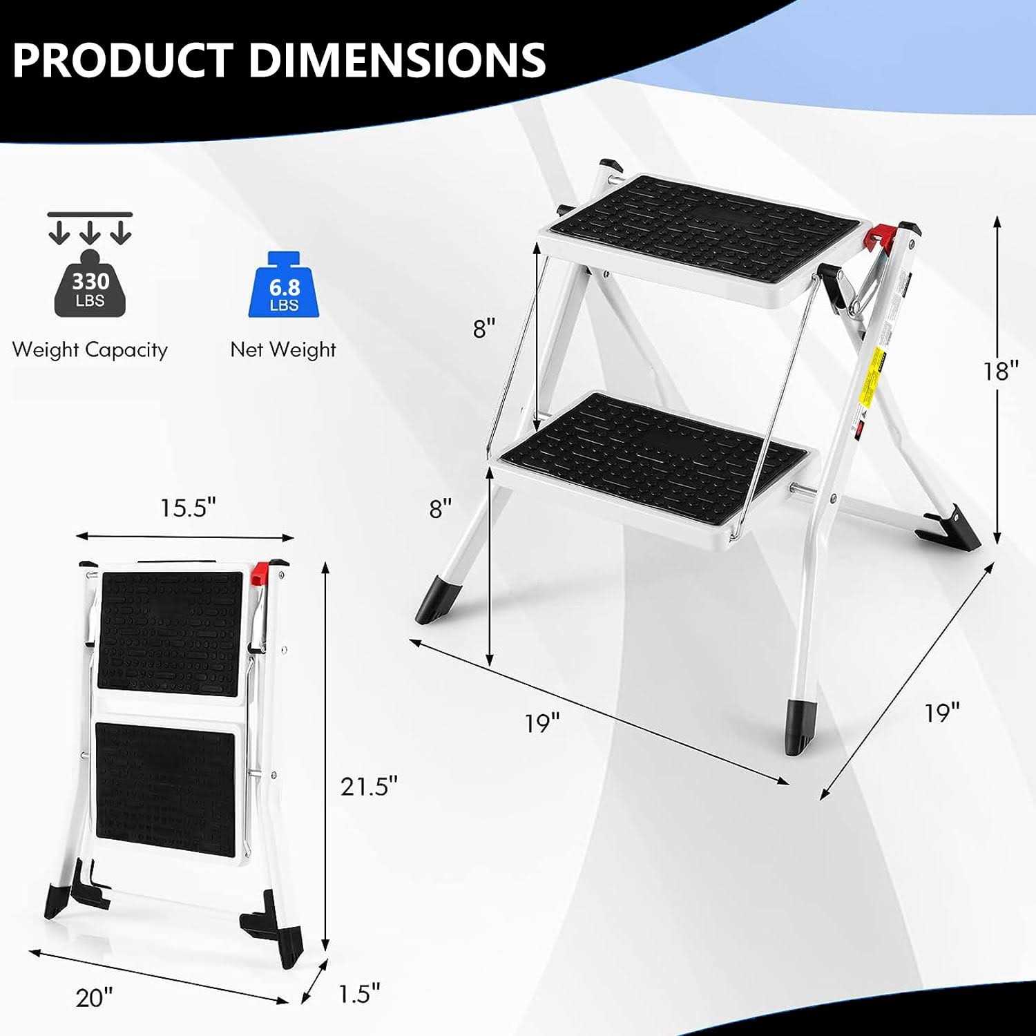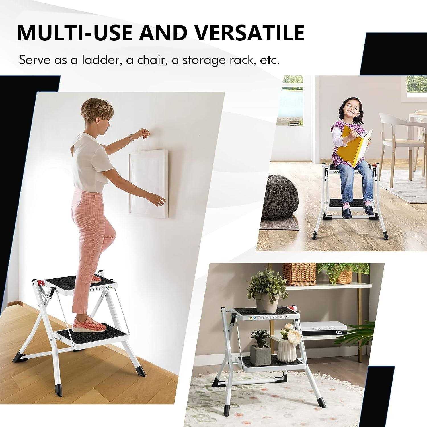 PHANCIR 2 Step stool Ladder, 330 LBS Capacity Folding Step stool for adults with Anti-Slip Pedals Large Foot Pads, Heavy Duty Steel Sturdy Portable Step Stool Ladder for Kitchen, Household, Office.br> Your ultimate companion for everyday tasks that require a little extra height. Safety, stability, and convenience are at the core of this innovative design, making it the perfect choice for your home or workplace. PHANCIR 2-step stool ladder is crafted from high-quality materials, ensuring a strong and stable structure. The anti-slip pedals offer a secure foothold, reducing the risk of accidents. Whether you’re reaching for items in the kitchen, garage, or warehouse, this ladder provides the stability you need. Upgrade your daily routines with our 2 Step Stool Ladder – a perfect combination of safety, stability, and convenience. Say goodbye to wobbly chairs and unsafe alternatives. Invest in your peace of mind today!
