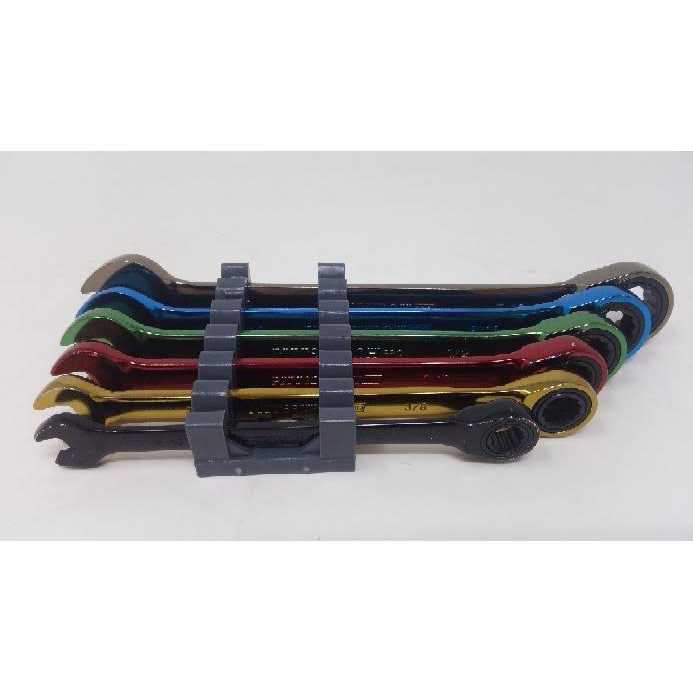 This ratcheting combo wrench set is color coded for easy size identification and designed to handle heavy use. The rugged chrome vanadium steel with chrome plating and a high polish finish for added durability. Each ratcheting wrench features 12 point ratcheting box ends for quick, smooth ratchet action.