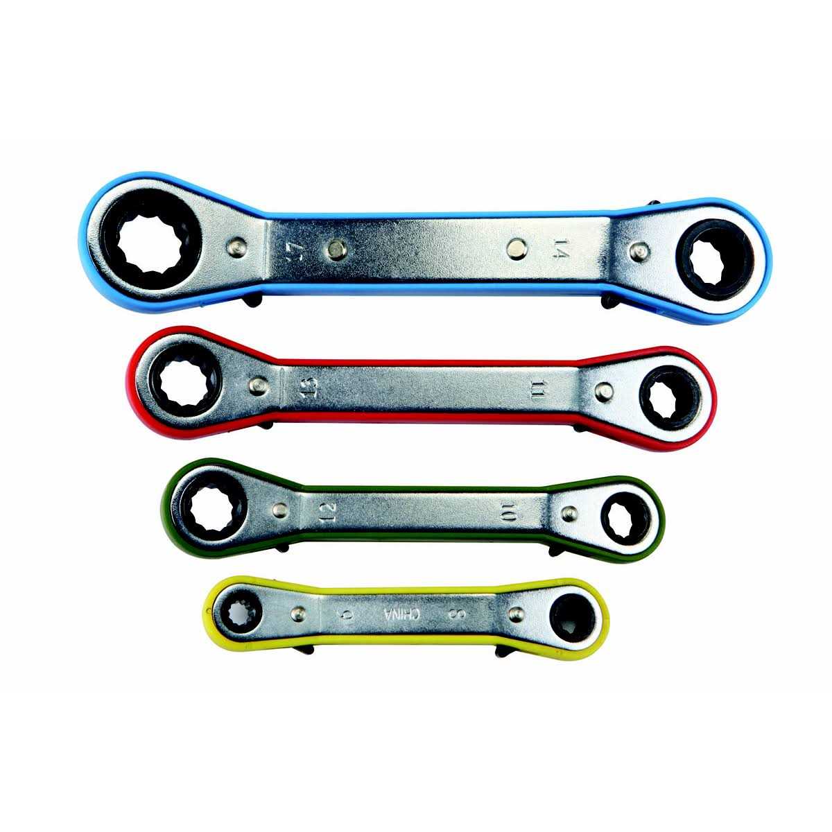 This convenient ratcheting wrench set is designed for accessing hard-to-reach nuts and bolts. Offset heads prevent bruised and scraped knuckles while 12 point box ends allow for a sure grip on fasteners. This set of reversible ratcheting wrenches is made of drop-forged heat treated alloy steel to withstand tough work environments and a variety of applications.