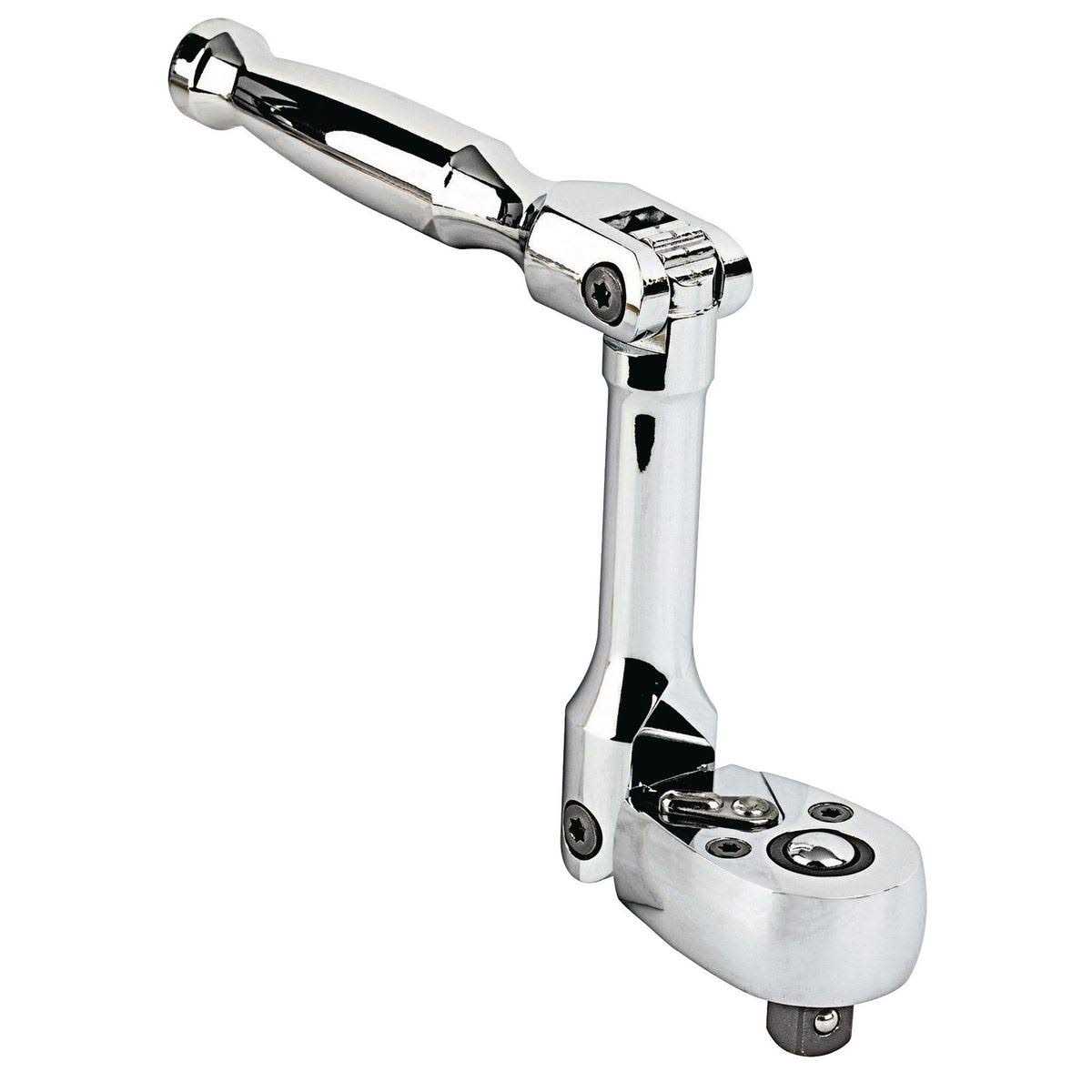 Hard-to-reach fasteners are no match for this flexible ratchet, designed specifically to bend at two points for outstanding reach and control. The ratchet features a contoured handle for a more comfortable grip. Made from forged and machine ground chrome molybdenum steel with a polished chrome finish, this flexible ratchet offers better functionality and performance than a typical ratchet. Socket quick-release button. Contoured handle for a comfortable grip. Forged and machine ground chrome molybdenum steel with polished chrome finish. Weight: 0.5 lbs. Bends at two points for incredible reach and control over hard-to-get fasteners.