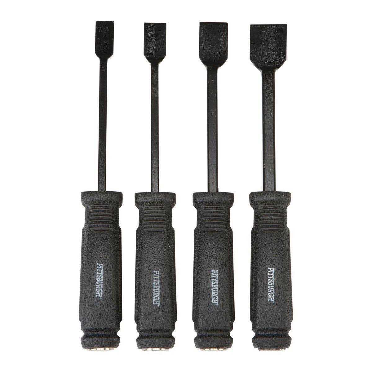 Handle countless heavy duty scraping jobs with this handy scraper set. Ideal for most prep and finish jobs, each piece in this scraper set includes a long shaft that goes through the entire handle for added durability and textured handles with contoured grips for a secure hold. Power through nearly any scraping job with the forged heat treated carbon steel blades in this scraper set.