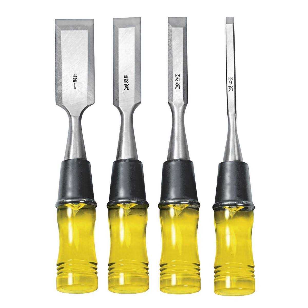 This 4 piece chisel set is made from heat-treated, high carbon steel with straight bevels and PVC handles for a comfortable grip. The sizes are 1 in., 3/4 in., 1/2 in., 1/4 in. – all chisels are 7-1/4 in. long.