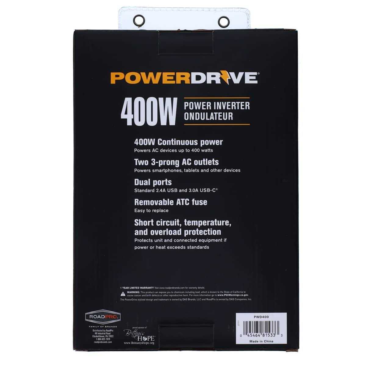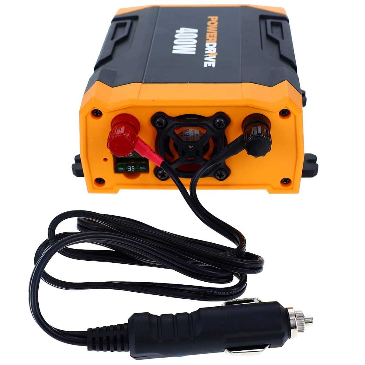 POWERDRIVE 400 Watt Power Inverter Enjoy the conveniences of home while on the road with the PowerDrive 400W power inverter able to power AC devices rated up to 400 watts with continuous power. Use this battery inverter to run your computer and other devices while on the road. You can power multiple appliances using the two 3-prong outlets and 2 USB ports on this car inverter. Easily remove and replace fuses on the PowderDrive 400-watt inverter 12v to 110v. Battery to inverter cables are an ample 36 inches long. A great gift for travelers or anyone who tailgates and camps. Use this DC to AC inverter to power small household appliances and laptops and more.