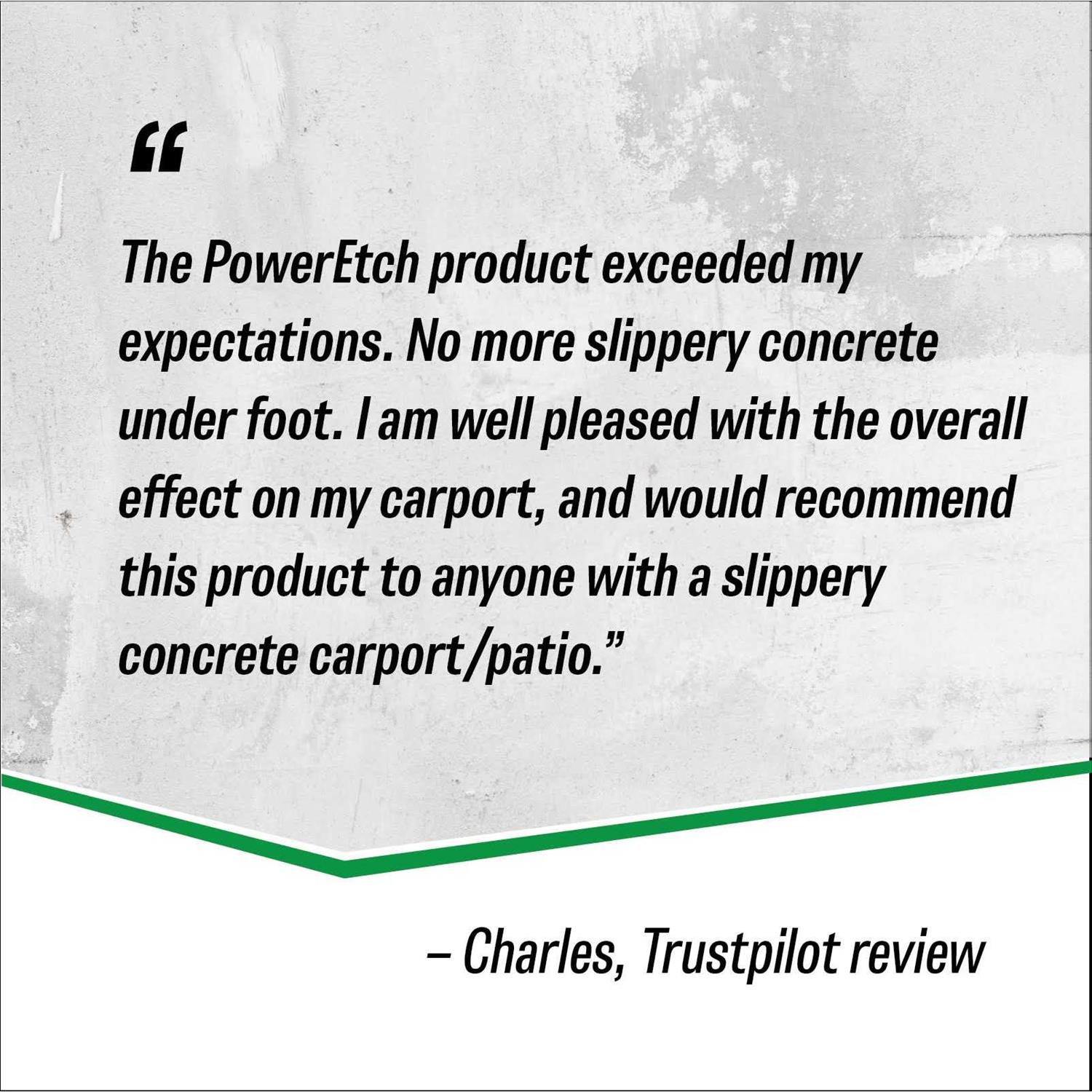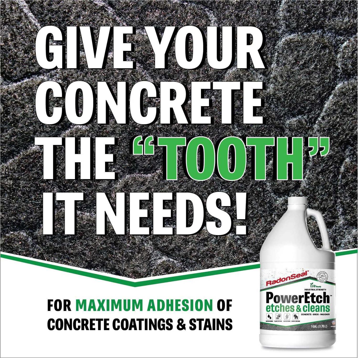 Product Description PowerEtch Concrete Etcher & Cleaner is an industrial-strength etcher and cleaning solution for profiling, neutralizing, and increasing the porosity of smooth or power-troweled surfaces. Safely and effectively prepare your concrete surface before applying penetrating sealers, stains, epoxy coatings, or paints. Prepping surfaces with PowerEtch Concrete Etcher & Cleaner will improve the bond strength of coatings and paints, improving performance and life expectancy. Open pores in smooth-trowled concrete to maximize penetration of penetrating sealers. PowerEtch removes rust stains, efflorescence, and the very common hazing/fogging that makes pavers and bricks look dull. PowerEtch will rejuvenate bricks and pavers making them look like new. Pro-Tip: Apply a high-quality penetrating sealer after etching to preserve the surface in a “like-new” condition for years. Use PowerEtch on garage floors, warehouse floors, slab-on-grade construction, factory floors, basement slabs, driveways, concrete patios, and sidewalks. The advantages to using PowerEtch — Powerful but safe. Non-corrosive to skin and will not “burn” concrete. Low-odor, easy to apply. No need to neutralize residue.