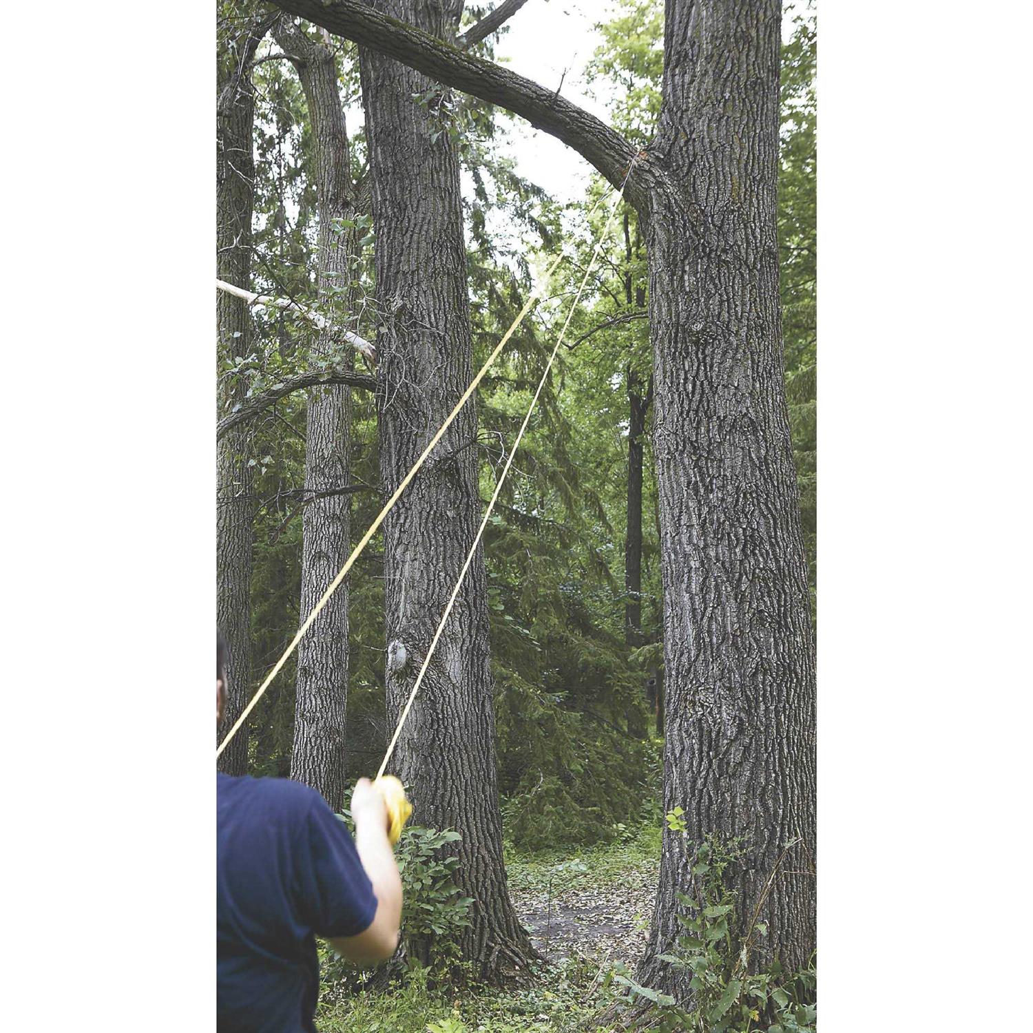 - Cuts limbs 25-feet, or add more rope for higher cuts.