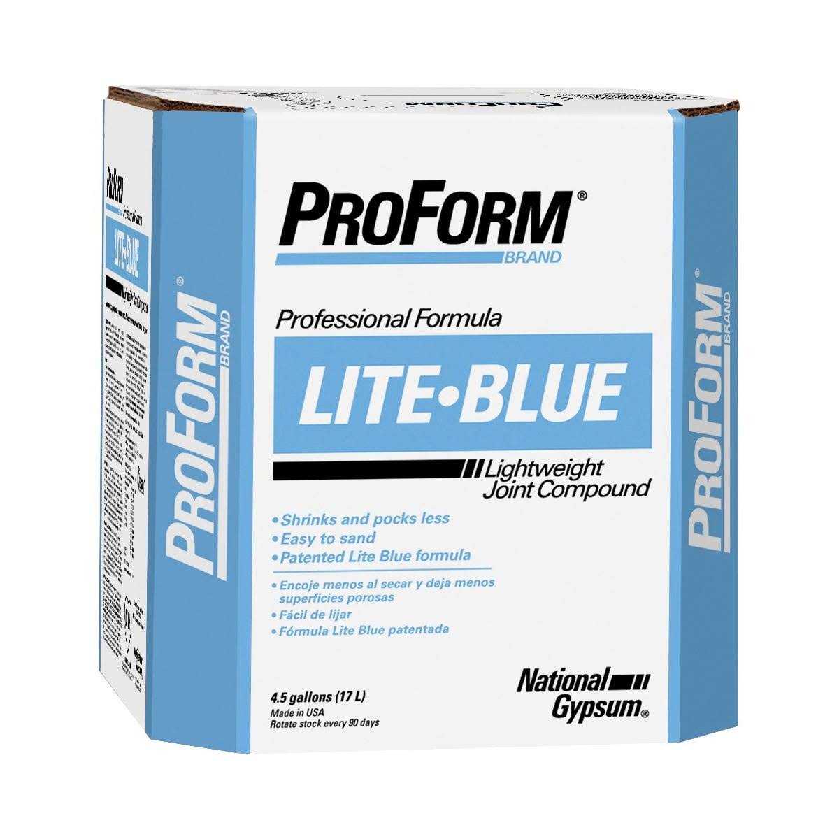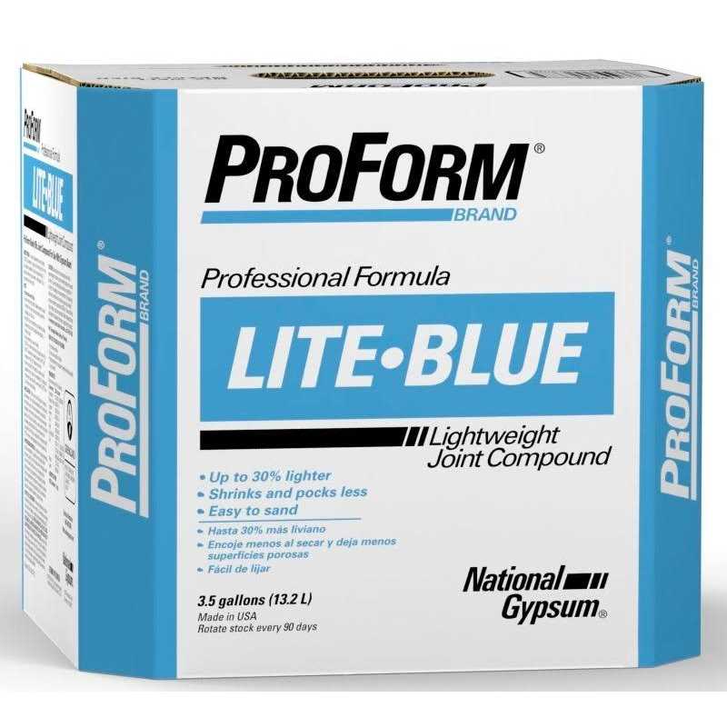 Proform brand lite-blue joint compound is a vinyl base ready mix light weight joint compound. Approximately 30% lighter than conventional ready mix, lite-blue joint compound pulls and sands easier, pocks less and reduces shrinkage by up to 33%.