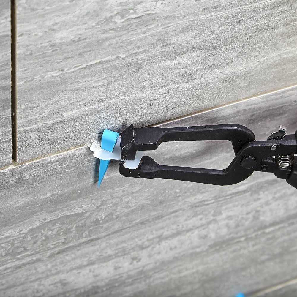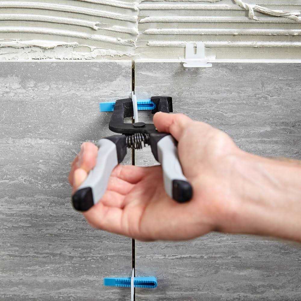 The tile level system is great to remove the tile slippage and crest perfectly leveled surface for both floor tile and wall tile. It includes clips (A), wedges (B) and pliers . They are used with tile between 3/16 in. and 7/16 in. thick. The clips (A) can provide 1/16 in. grout line. The system is very easy to use. Just slide two clips (A) under the tile approx. 2 in. from each end of the tile. And then slide a wedge (B) into each clip. Tighten with pliers until tiles are snug against bottom of the wedge. Move tiles so that slides are aligned and tiles are pushed tightly against clip (A). Let mortar dry and use the pliers or kick side of clips (A) to nap them off. Wedges (B) and pliers can be reusable. All are sold separately. Create perfectly leveled surfaces for floor tiles The leveling system includes clips A, wedges B, and pliers C Pliers are drop forged steel for durability Patented designed break-off point on clips for swift removal