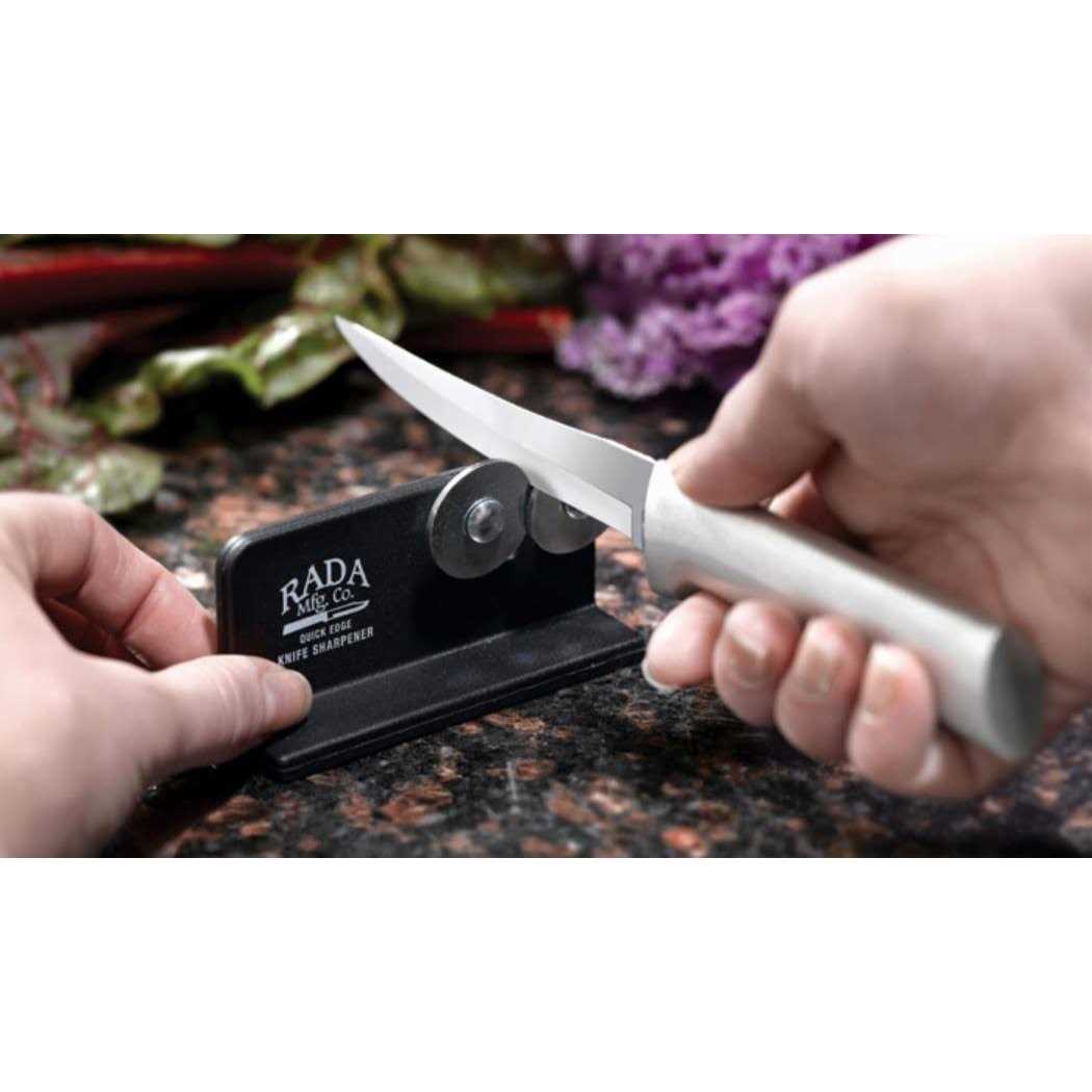 Rada’s Quick Edge Knife Sharpener renews the blades of your non-serrated knives to their original super-sharp status. The process is easy. Simply grip the base with one hand and pull a knife blade between the wheels four to six times with the other hand. Wipe off the blade using a soft towel to remove any metal shavings and you’re done! This invaluable tool is inexpensive too because sharp knives shouldn’t be a luxury. Get your straight-edge knives in tip-top shape in just seconds. With a few quick pulls, your blades are as good as new. The sharpener’s dual wheels—made from specially hardened, high-carbon stainless steel—intersect to sharpen both sides of a knife blade at once. Its simple design makes sharpening easy. The small size—just 3½” by 2″–means you can tuck it away inside a drawer or cabinet until it’s needed. Great for hunting and fillet knives too—keep one in your tackle box!
