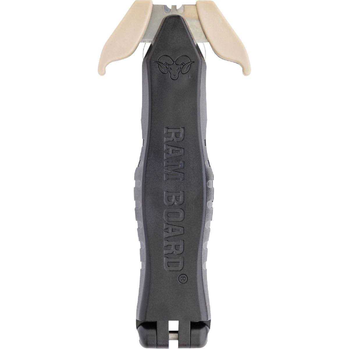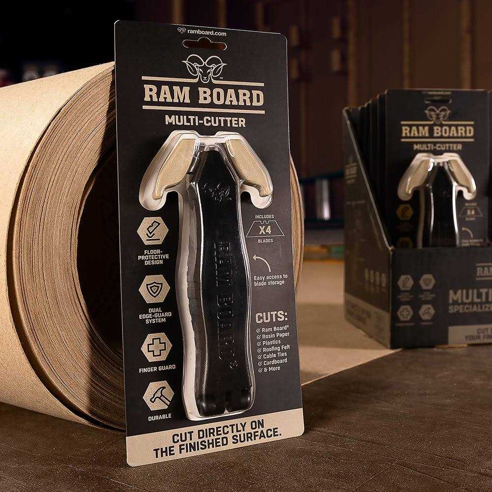 Designed to easily and safely cut Ram Board surface protector.Engineered with an Exclusive Dual Edge Guard System the Ram Board Multi-Cutter protects flooring from damage and scuffs while cutting. Ergonomic, anti-slip grip handle is designed for comfort and safety. Magnetic closure provides easy access to internal storage of replacement blades.