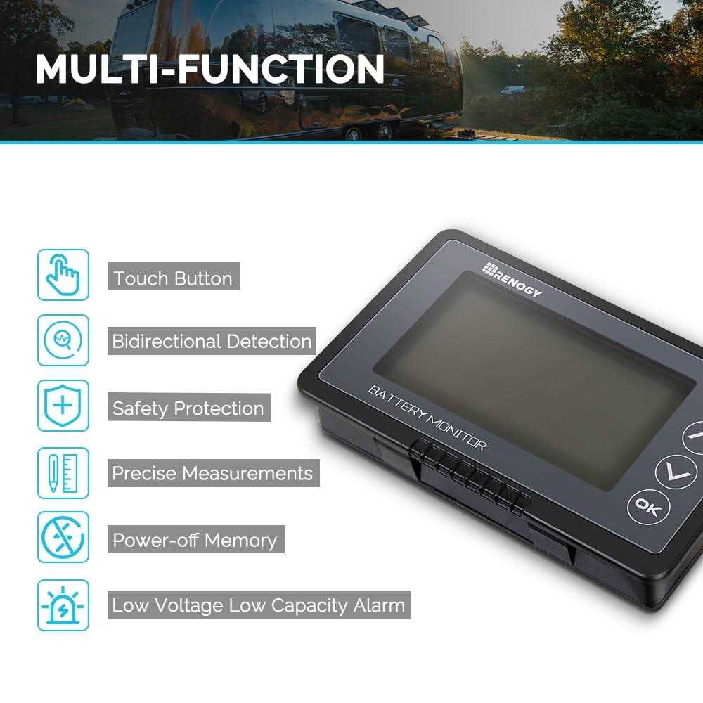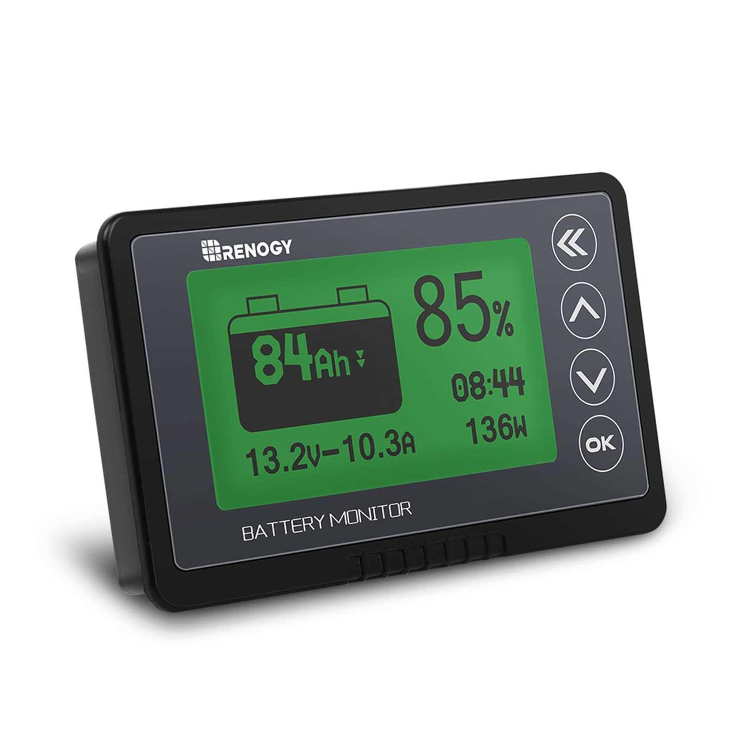 Renogy 500A Battery Monitor is able to monitor the amperage flowing out of the battery bank & Measure currents up to 500 amps. Voltage, current, consumed power & battery capacity are all accurately measured & displayed on the LCD screen in real-time. The Battery Monitor is intended to help maintain battery systems for 12V deep cycle batteries, such as ones found in RV, boats or off grid homes, which are regularly charged & discharged. It measures the rate of energy going in or out of your batteries so you can check your charging systems & see how much energy your appliances use. This is a big help when youre trying to conserve energy. The Renogy Battery Monitor will help you keep track of how charged or discharged your batteries are. It will let you discover if your charging systems are charging to the proper voltage, which is important for maximizing your battery life.