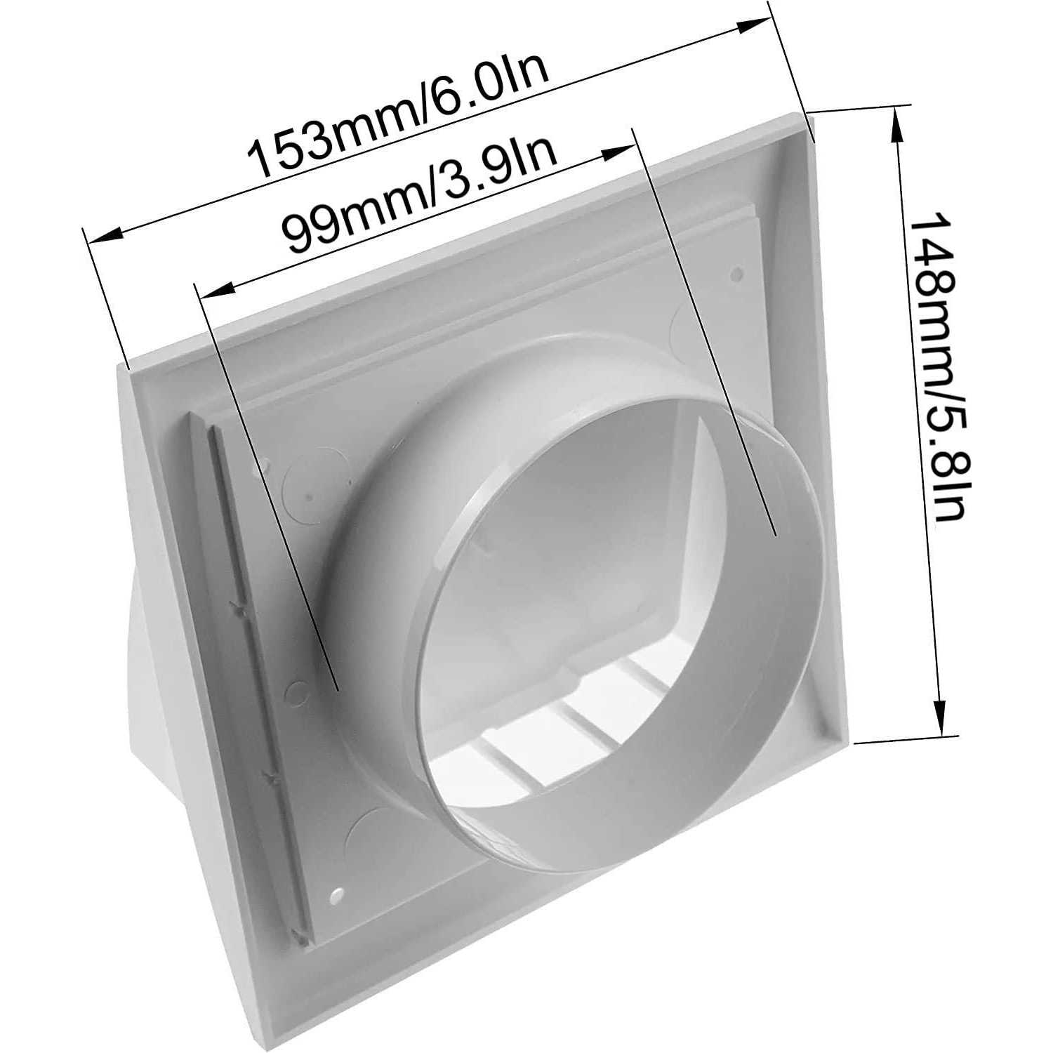 Usable indoors and outdoors. Easy to install fresh air exhaust vent cap – grille cover. Designed for maximum airflow. This product has a one directional flap. Paintable plastic components contain UV stabiliser to reduce fading due to exposure to sunlight. Helps keep wind, rain, snow, pests and birds from entering outdoor dryer vents. Fits a 4-inch diameter pipe/vent opening. The outside dimensions of the cap cover plate are 6 x 6 Made from durable, high quality and long lasting material.