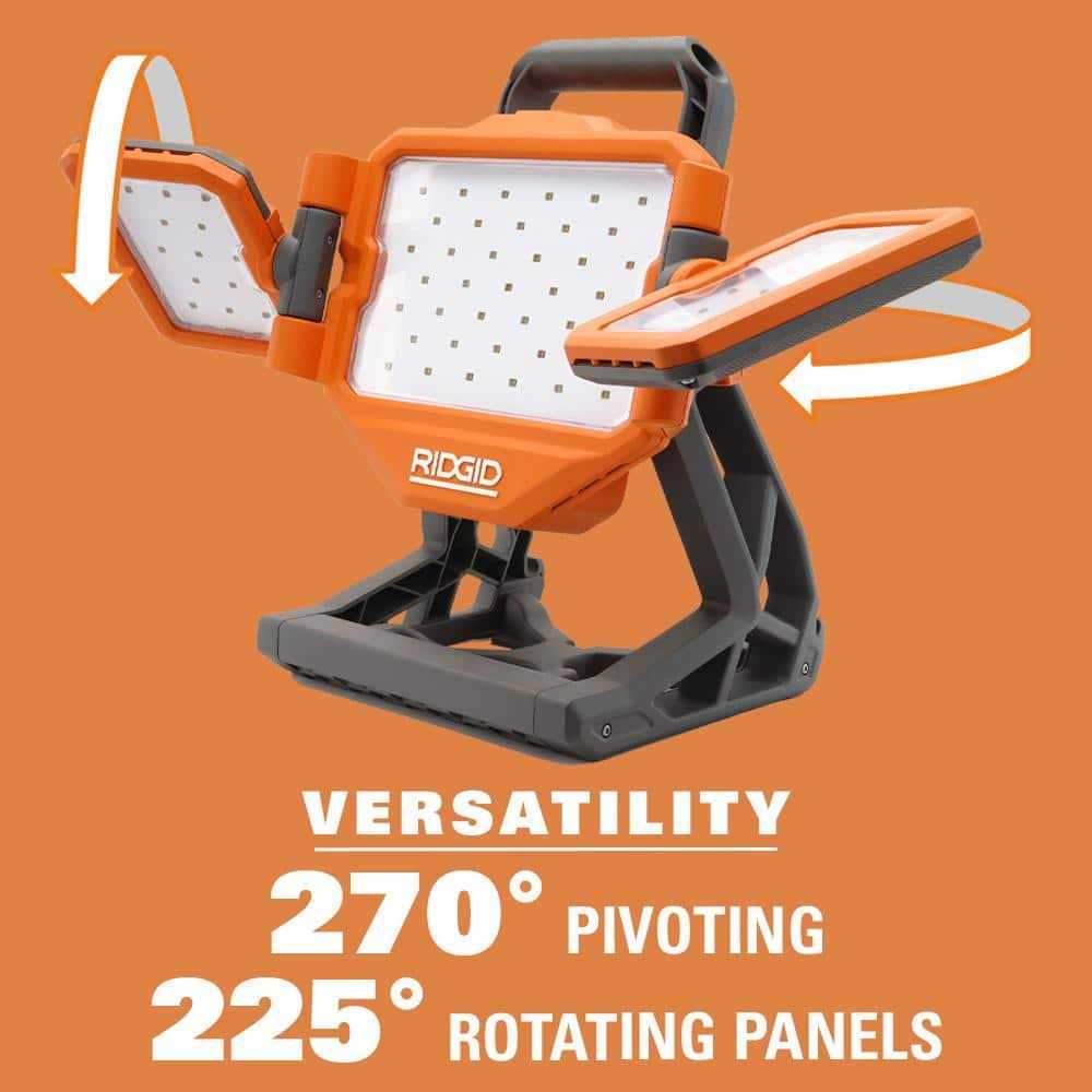The folding panel design provides total area lighting capabilities on a work site. To maximize versatility, the RIDGID Panel Light features three different types of rotation: 270° panel pivot (panel up & down), 225° panel rotate (panel open & close) and 115° base pivot (up & down). For added usability and convenience, the panel light offers a carrying handle, keyholes and a 1/4 in.-20 tripod mounting thread.