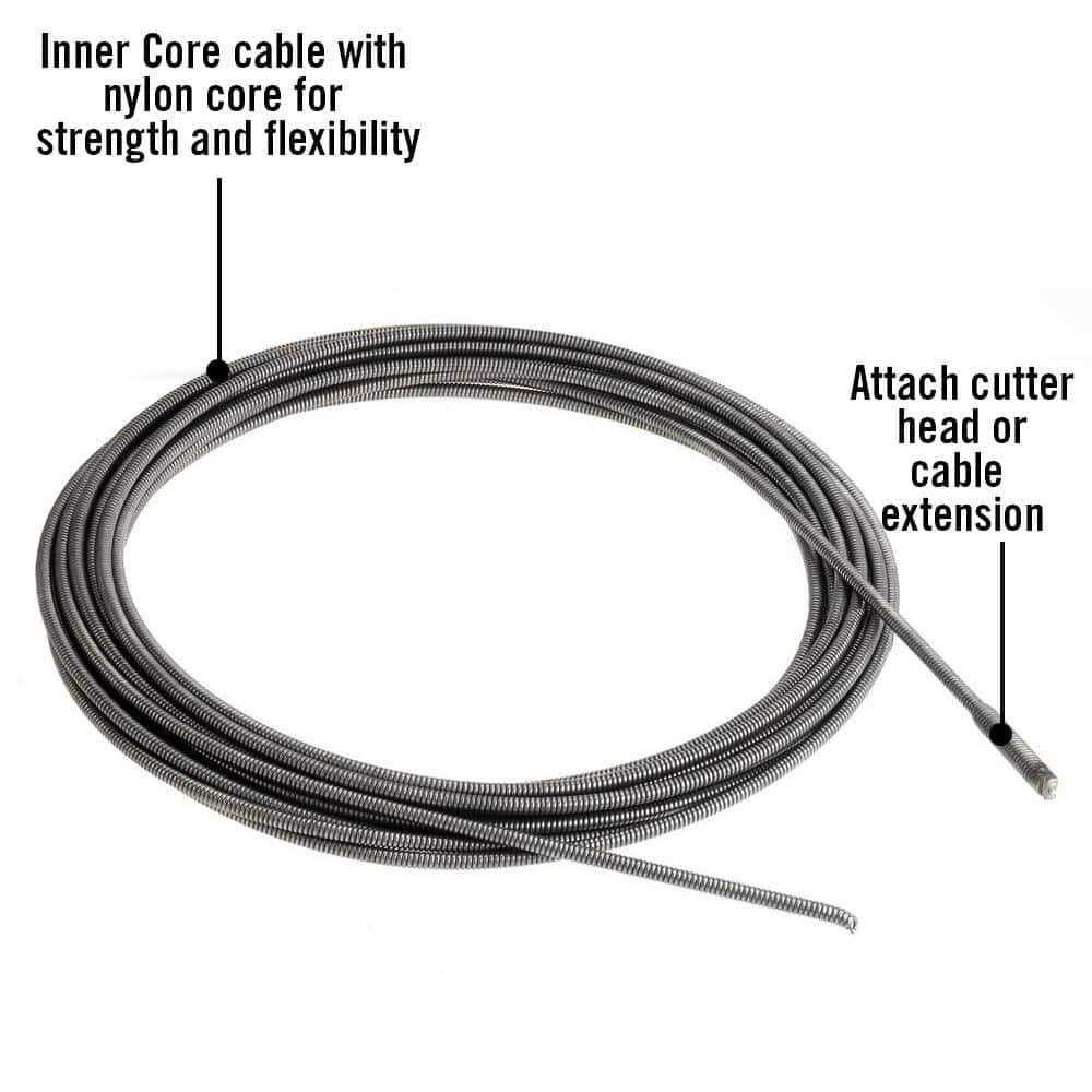 This inner core drain cleaning cable is made of steel and measures 75 feet length x inch diameter. It has a 1 to 2 inches line capacity and a -inch male coupling connector. The cable has good flexibility and resists kinking. It stiffens and transfers greater torque to the cutter and is suitable for use with K-3800 drum machines.