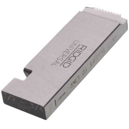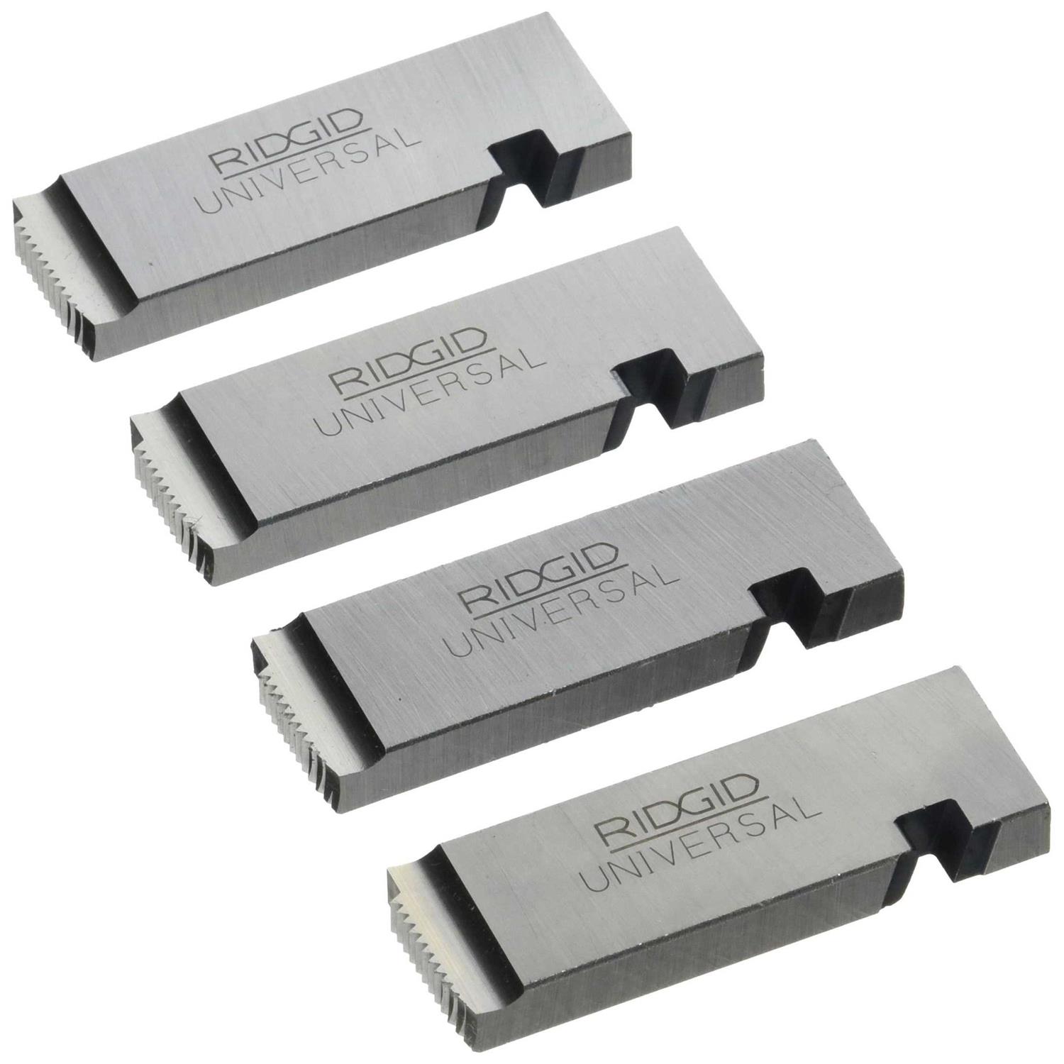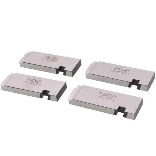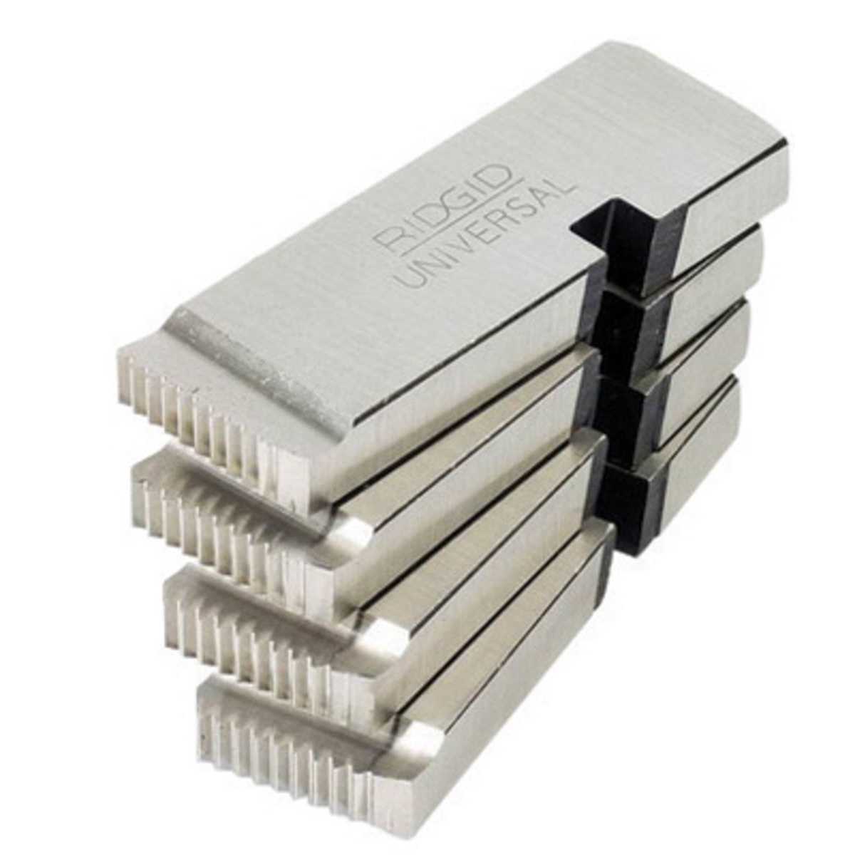 RIGID 47745 one half inch to three quarter inch NPT (Nominal Pipe Size-Threads Per Inch) dies are compatible in the Wheeler Rex 897065 Universal Die Head and the RIDGID 97065 Universal Die Head. The Die Heads can be mounted onto several different threading machines from either RIDGID or Wheeler Rex. The Dies in the head can be easily changed and if the Die Head is mounted to a machine the Die Head does not need to be removed from the machine for die changes. Dies have notches designed into them that will click into position inside the die head with its spring balls that catch the die and allow the operator to easily know when the dies are correctly installed in the Universal Die Head. And the die blades are designed with a two-step cut method which provides a very stable bite into the pipe, allowing any external coating to be removed as the pipe is cut at the same time. Dies from RIDGID are marked for easy identification of the type of pipe and the sizes they are designed to cut for easy identification. Dies are crafted from tool steel and designed for right hand cutting of threads.