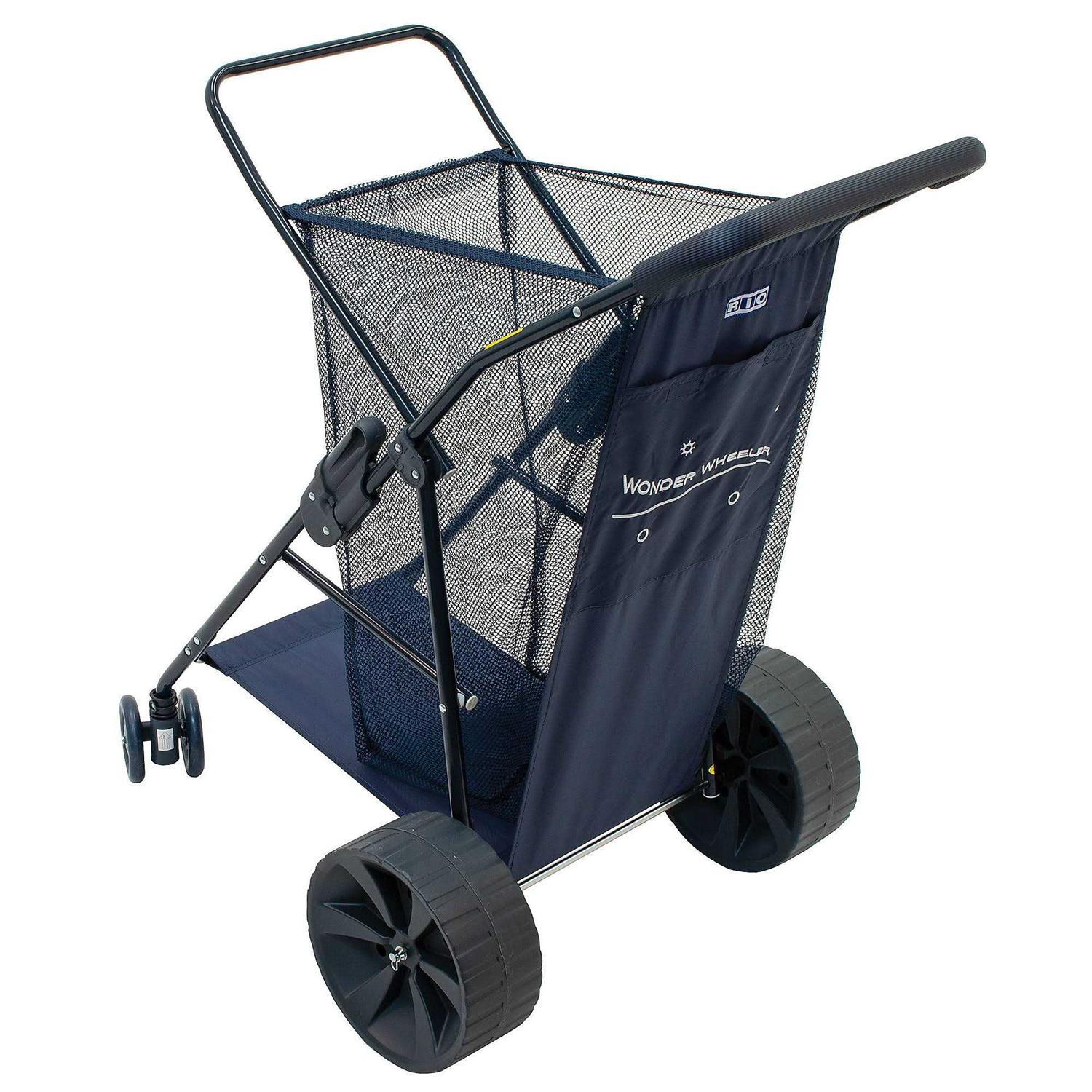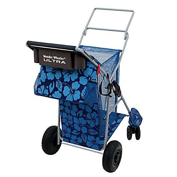 This Wonder Wheeler Plus wide wheels is a perfect way to transport all your chairs and belongings to the beach. It features a 10 diameter, dual 4 inch wide front pivot wheels and large mesh storage pouch. It holds up to 4 beach chairs.
