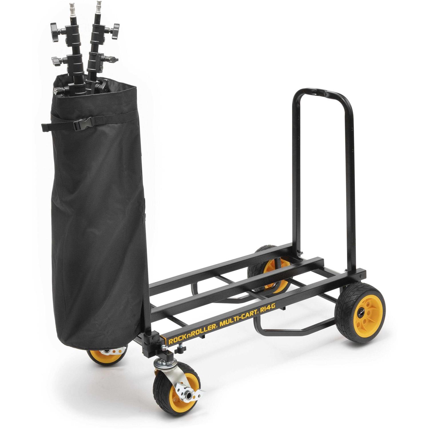 A transportation solution that works for the long haul. Rock N Roller Handle Bags are constructed from durable 600D polyester. These removable bags slide right over the R14, R16 and R18 Multi-Cart handles for easy installation and removal. The mounting holes on Rock N Roller Multi-Cart handles are accessible, allowing various other accessories to be used. A webbing strap across the top makes securing items a cinch, while a quick release buckle facilitates fast freedom. If you’re transporting anything from tripods, lighting, microphone stands, speaker stands, to photography backdrops and more, let Rock N Roller handle it.