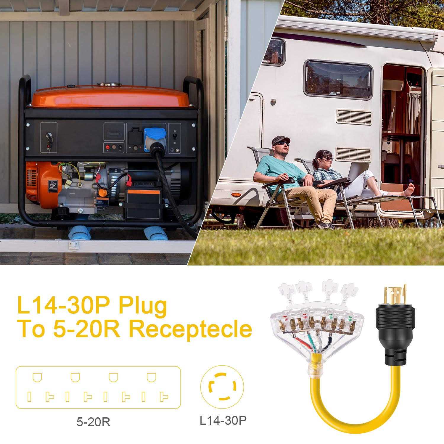 Brand: Rophorcolor: Yellowfeatures: 【rv Generator Adapter Cord】: 15 Amp To 30 Amp Rv Generator Adapter Converts A 30a Locking Receptacle On A Generator To 4x 5-20 Grounded Outlets That Accept Standard 5-15 Or 5-20 Grounded Cords; Power Four Pieces Of Equipment Up To 3750 Watts With This 30 Amp Generator Cord. 【safety Assurance】: 10 Awg 4 Conducor Heavy Duty Cord Made Of Copper With Pvc In Ul 62 Standard For Heat-proof Insulation And Antioxidants, And Plug In Ul 817 Standard Support. The Clear End Receptacles With Dust Protection Caps, Provide Optimum Performance And Added Safety. 【hight Quality Material】: 600volt Thermoplastic Stw Jacket And 10 Awg (american Wire Gauge) X 4c All-copper Wires, Features Excellent Abrasion, Oil And Moisture Resistance And Flexibility. It Should Last For A Long Time Even With Rugged Use. 【produc Specification】: Support Max 30 Amp Overload, 125v, Max Wattage 3750 Watts, 1.5 Feet,stw Power Cord With 125/250v L14-30p Male Plug And 125v 4x 5-15/20r Female Receptacle. 【why Choose Us】: Rophor Specializes In The Production Of Various Adapter Power Cords. 100% Of The Products Have Been Rigorously Tested To Ensure That Each Product Received By Our User Can Work Perfectly. Ean: 0610625549251package Dimensions: 10.9 X 7.0 X 2.0 Inches