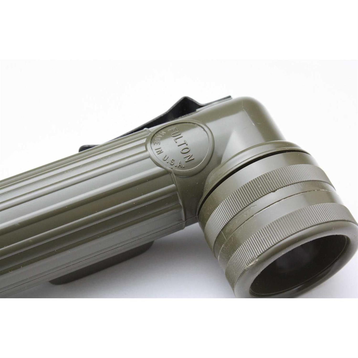 Genuine Fulton GI Army Olive Drab Mil-Spec D Cell Angle Head Flashlight Includes color lenses spare bulb. Made in USA! Genuine Fulton army style angle head flashlight in olive drab. Features high density construction with pocket clip. Signal steady-on modes. Includes red blue interchangeable lenses and spare bulb. Measures 8″ tall. High Density Construction. Metal Belt Clip. Waterproof.