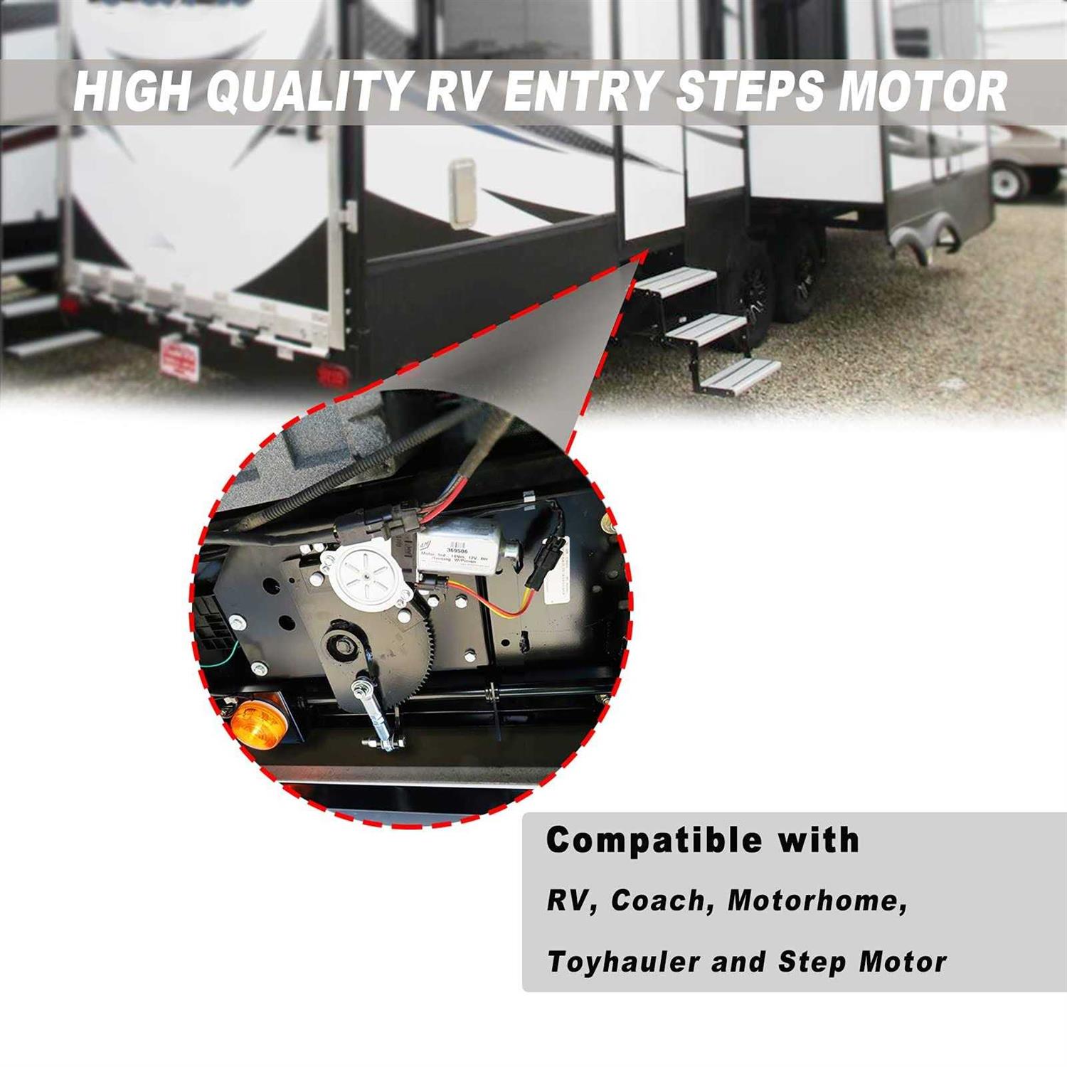 REPLACE THE FAULTY MOTORIf your RV Entry Stepsis retracting or extending only part of the way or won’t stay retracted while driving, or the motor continues to run with a clunking or grinding noise after the step is retracted then it is likely that the transmission/gear in the motor needs to be replaced. INSTALLThe entry-level stepper motor of the electric caravan is easy to install, it can perfectly replace old products, seamlessly fit, that is installed and used. The installation time is short, the installation process will take you about 20 minutes, reducing your unnecessary time. (The installation tutorial can refer to the detailed introduction below).