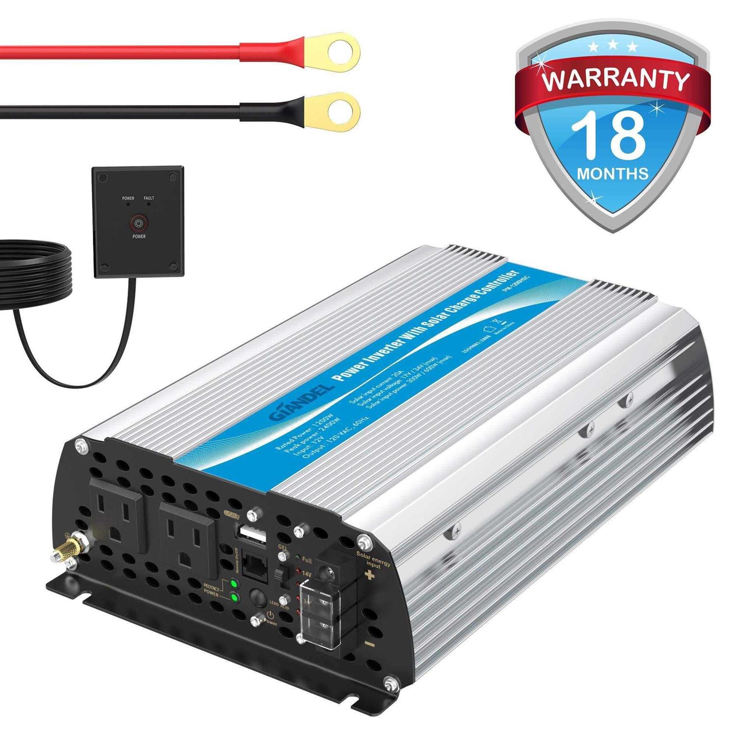 GIANDEL A leading inverter brand in Australiahas devoted to providing quality inverters and service for 10 years – Giandel Inverters have been well known in Australia and a Must for road trips vacations outdoors emergency kits and more Specifications Power (2 AC Outlets) 1200W Rated 2400W peakgive more power than 1000W inverter USB output 1x – DC 5V/24A(max) Output wave modified sine wave Nominal input voltage98-16VDC Nominal output voltage 110-125VAC Internal fuses4*35A Battery cablesone pair with length of 2 feet Remote controller remote controller with 15ft cable More convenient to control the inverter ON/OFF 20A solar charge controller(PWM) suitable to connect 300Watt(15-18VDC) solar panel Battery status indicator display the voltage of battery while charge it by solar panel Battery select switch set to GEL or SLA according to your battery Built-in cooling fan only starts working when temperature is over 104a? More details and tips connect the inverter to a 12V battery and plug your AC devices into the inverter Please do not leave the power inverter in the ON position while your car is off Disconnect the positive battery terminal before doing any wiring to the inverter Do not put the inverter into sunlight directly keep it in cool and dry environment Dont use the inverter with a product that draws a higher wattage the inverter can provideas this may cause damage to the inverter and product Package List 1x 1200W Power Inverter 2x Battery Cables 1x – Remote Controller with 15ft Cable 1x – User Manual