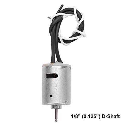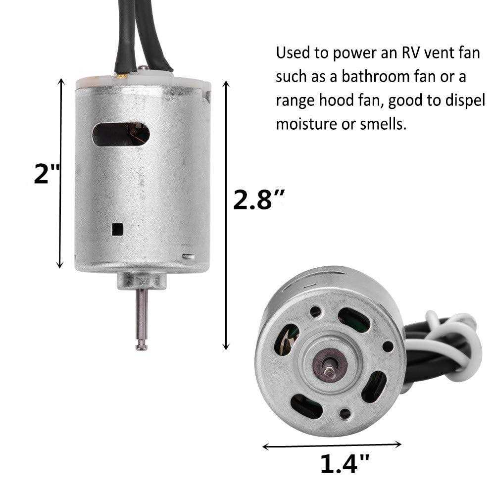 【12V Power Vent Motor】This motor is replacement motor for 12V RV roof vent fan. Brush DC motor with 0.125 APM rating, 1.5W working power; 5,000 RPM; Can be used to power an RV vent fan such as a bathroom fan or a range hood fan, good to dispel moisture or smells. 【1/8″(0.125″) D-Shaft】The fan motor body size is 2-1/5 inch length x1-2/5 inch diameter (57mmx36mm), D-shaft size is 1/8 inch x 3/5 inch(3.17mm x 16mm), 18AWG*2 terminal connect cords (White 20-inch/50.8cm with 7-1/4-inch/18.5cm black jacket; Black 8-inch/20cm with 5-1/2 inch/14cm black jacket) 【ROTATION 】This rv vent motor has reverse polarity, meaning that it can be wired to turn in either clockwise or counter-clockwise rotations; Rotation direction depends on your fan blade wiring (one wire goes to the hot side of switch, other goes to ground); To determine the direction of spin on your existing fan, look down through the motor at the top of the blade. 【Competiable Brands】This fan motor is compatible for vents like Elixir, Heng’s, Jensen, Ventline and similar 6-inch (15.2cm) fan blades. Pls check pictures and dimensions carefully before you order. 【Easy to Install】Wire your fan to the motor switch, then wire the switch to your RV; Ensure that the wires connect black to black (grounds) and the other wires connect together; Save your old fan blades – Pull on the hub (center part of blades) off the shaft and push the center hub of the blades back on the new motor shaft (Flat side on motor shaft used to align the hole in the hub and slide on); Mounting screws and fan blade not included. 【12V Power Vent Motor】The motor is replacement motor for 12V RV roof vent fan. Brush DC motor with 0.125 APM rating, 1.5W working power; 5,000 RPM; Can be used to power an RV vent fan such as a bathroom fan or a range hood fan, good to dispel moisture or smells. 【1/8″(0.125″) D-Shaft】The motor body size is 2-1/5 inch length x1-2/5 inch diameter (57mmx36mm), D-shaft size is 1/8 inch x 3/5 inch(3.17mm x 16mm), 18AWG*2 terminal connect cords (White 20-inch/50.8cm with 7-1/4-inch/18.5cm black jacket; Black 8-inch/20cm with 5-1/2 inch/14cm black jacket) 【ROTATION 】This power vent motor has reverse polarity, meaning that it can be wired to turn in either clockwise or counter-clockwise rotations; Rotation direction depends on your fan blade wiring (one wire goes to the hot side of switch, other goes to ground); To determine the direction of spin on your existing fan, look down through the motor at the top of the blade. 【Competiable Brands】This fan motor is competiable for vents like Elixir, Heng’s, Jensen, Ventline and similar 6-inch (15.2cm) fan blades. Pls check pictures and dimensions carefully before you order. 【Easy to Install】Wire your fan to the motor switch, then wire the switch to your RV; Ensure that the wires connect black to black (grounds) and the other wires connect together; Save your old fan blades – Pull on the hub (center part of blades) off the shaft and push the center hub of the blades back on the new motor shaft (Flat side on motor shaft used to align the hole in the hub and slide on); Mounting screws and fan blade not included.