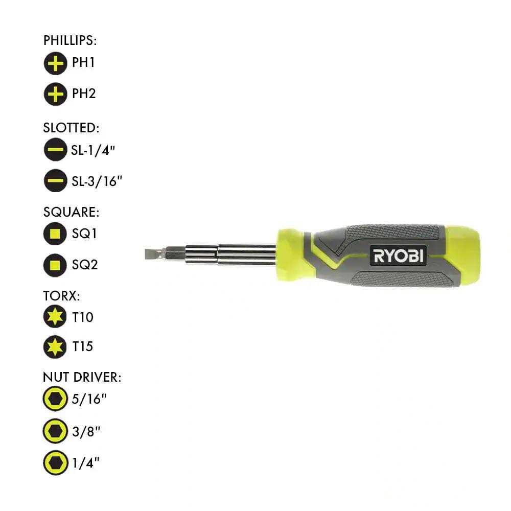 The RYOBI 11-in-1 Multi-Bit Screwdriver is designed with some the most common bits and nut drivers needed. The magnetic tip hold increases fastener retention. The tip identifier and anti-roll design aid in easy identification and keeping the screwdriver in place. Included is (1) Handle, (1) PH1, (1) PH2, (1) SL-1/4 in., (1) SL-3/16, (1) SQ1, (1) SQ2, (1) T10, (1) T15, (1) HEX 5/16 in., (1) HEX 3/8 in., (1) HEX 1/4 in.