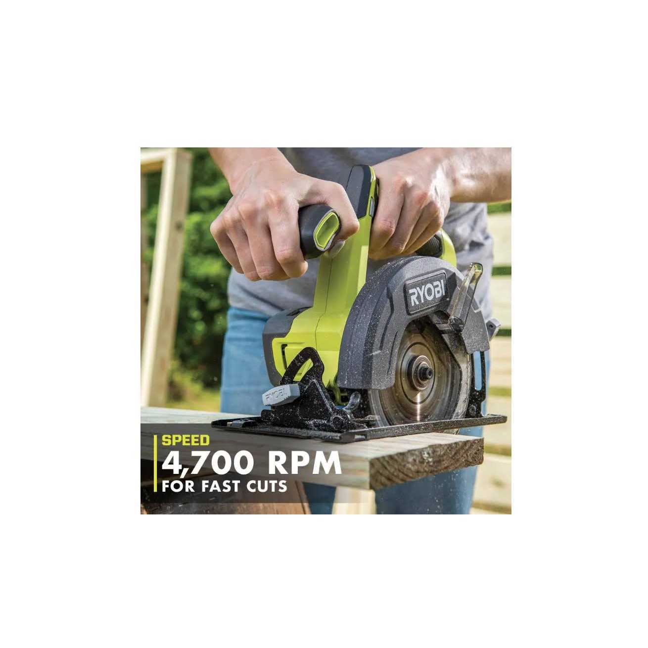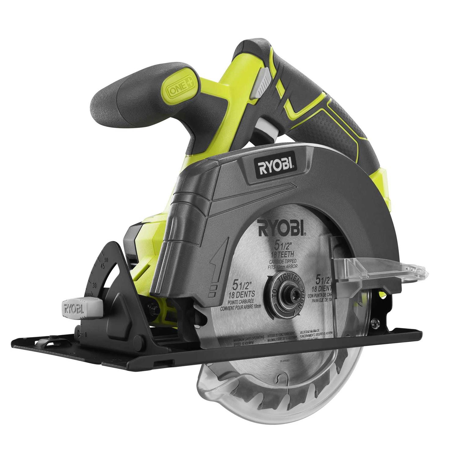 Circular Saws by RYOBI. Details:Expand your RYOBI 18V ONE+ System with the RYOBI 18V ONE+ Cordless Circular Saw. Make over 215 fast, clean cuts per charge on the ONE+ Cordless 5 1/2 in. Circular Saw with 4,700 RPM and the included 18T Carbide Tipped Blade. This saw is ideal for cross cuts in 2-by material with 1-11/16 in. maximum depth of cut. Bevel up to 50 degrees to complete a wide variety of cuts and with 1-3/16 in. depth of cut at 45 Degrees of bevel. Best of all, it is part of the RYOBI ONE+ System of over 260 Cordless Tools that all work on the same battery platform. This 18V ONE+ Cordless 5-1/2 in. Battery and charger sold separately.