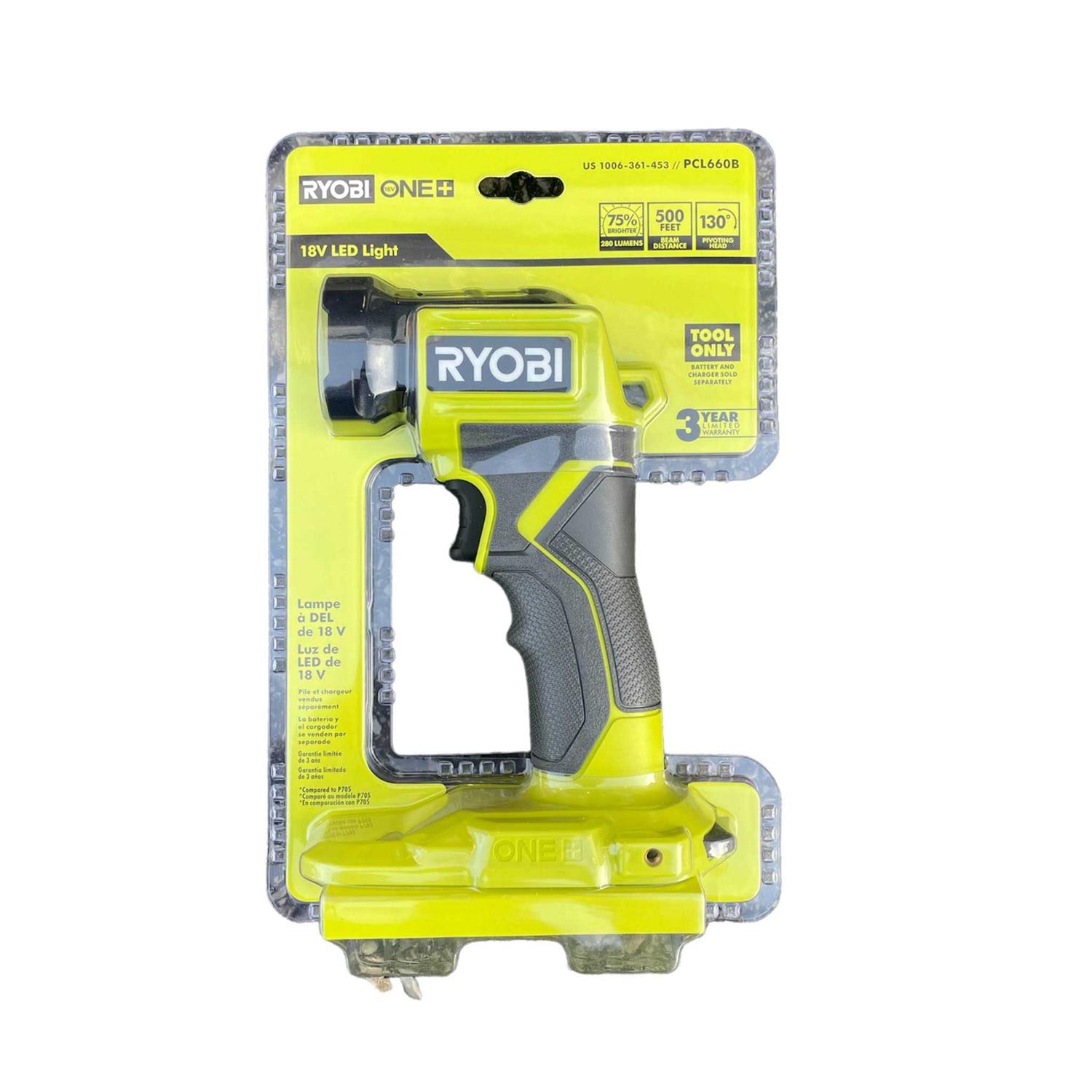 Job Site Lighting by RYOBI. Details:RYOBI 18V ONE+ Cordless LED Light. With 280 Lumens and up to 22 hours of runtime, you’ll never be left in the dark. This LED Light has over 500 feet of beam distance to illuminate whatever area you’re working in. It also features a 130 degree pivoting head for adjustable beam direction. Best of all, it is part of the RYOBI ONE+ System of over 260 cordless tools that all work on the same battery platform. Battery and charger sold separately.