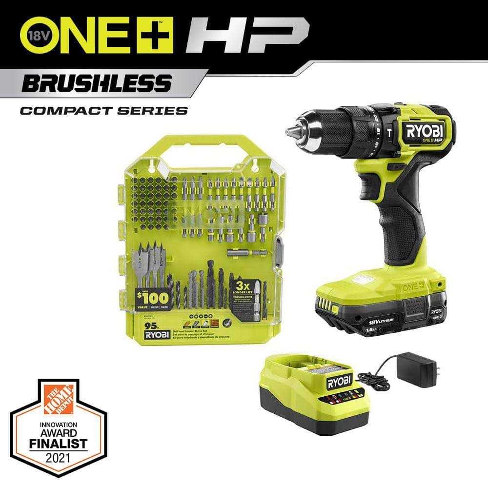 Ryobi One+ HP 18V Brushless Cordless Compact 1/2 in. Hammer Drill Kit with (1) 1.5 Ah Battery, Charger, & 95pc Bit Set