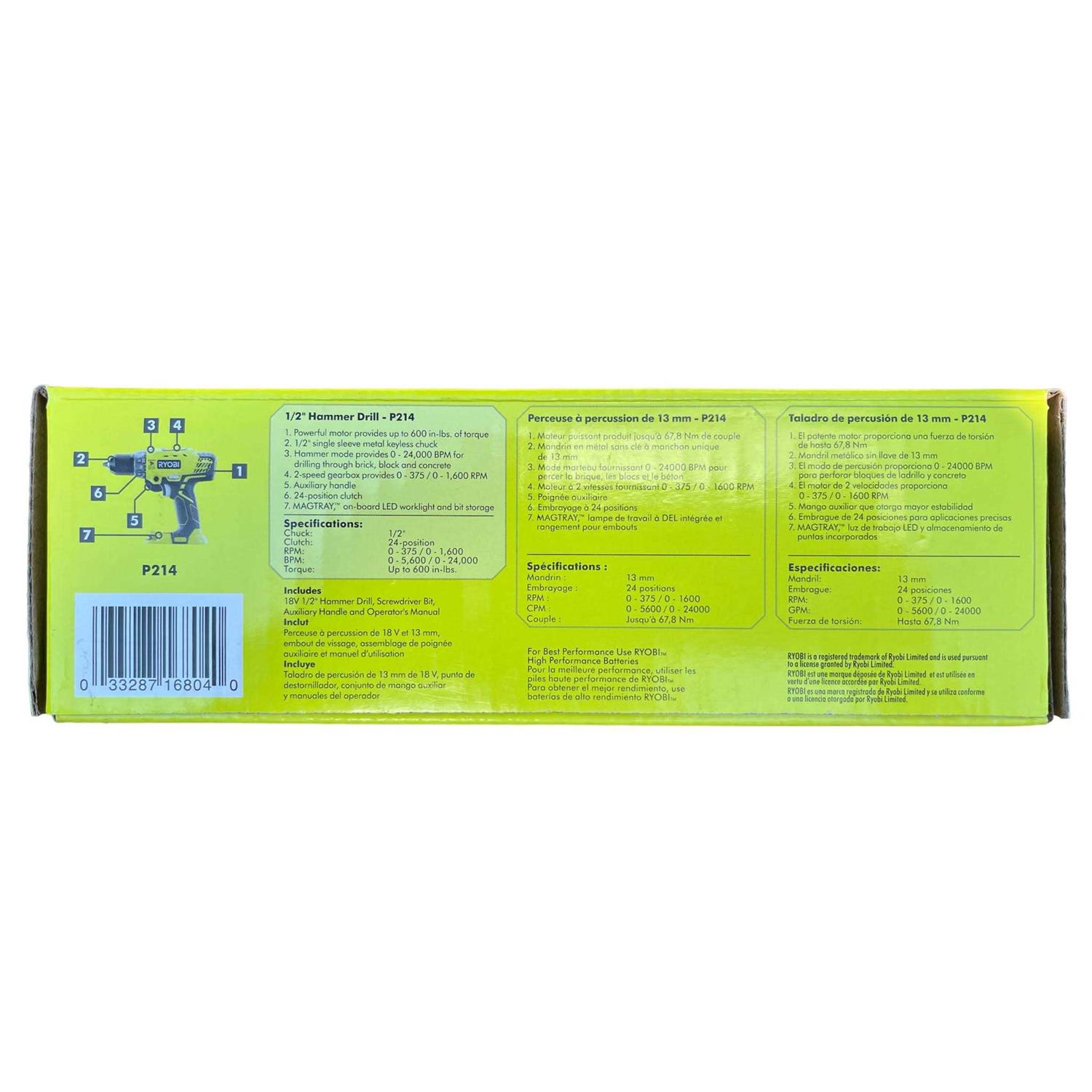Ryobi P214 One+ 18 Volt Lithium Ion 1/2 inch 600 Pound Torque Hammer Drill/Driver (Tool Only) with Handle (Non-Retail Packaging)