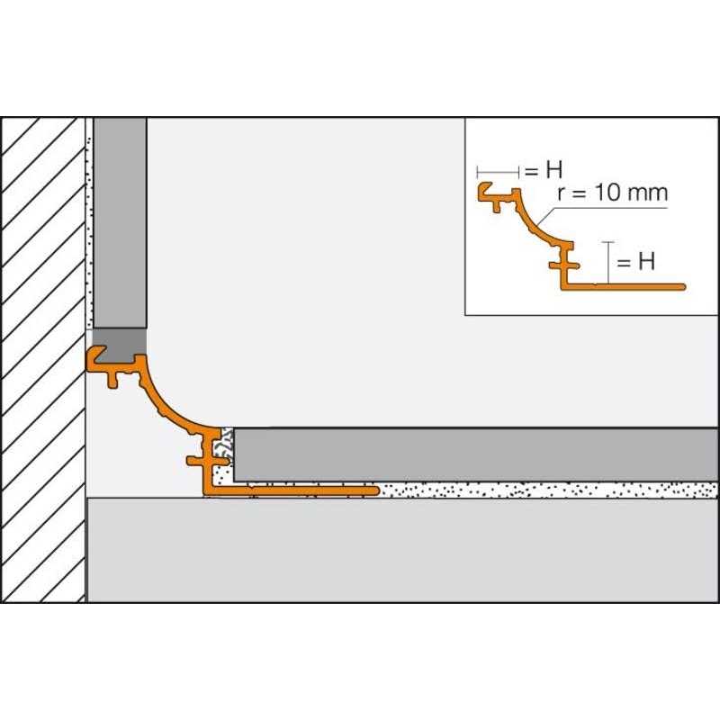 The DILEX-AHKA is an anodized-aluminum, cove-shaped profile for transitions between walls to be tiled and previously finished floors. Features a single trapezoid-perforated anchoring leg that is secured in the mortar bond coat and a dovetailed channel which is bonded to floor surfaces. Features a 3/8-in wide radius cove section which prevents the accumulation of dirt, making cleaning simple. Prevents surface-water penetration and meets the strict hygienic requirements of commercial kitchens, bathrooms and food-processing plants. Ideal for tiled environments where a sanitary cove base is desired. Integrates with DILEX-AHK and RONDEC profiles. Profile length is 8-ft and accommodates tiles that are 3/8-in thick.
