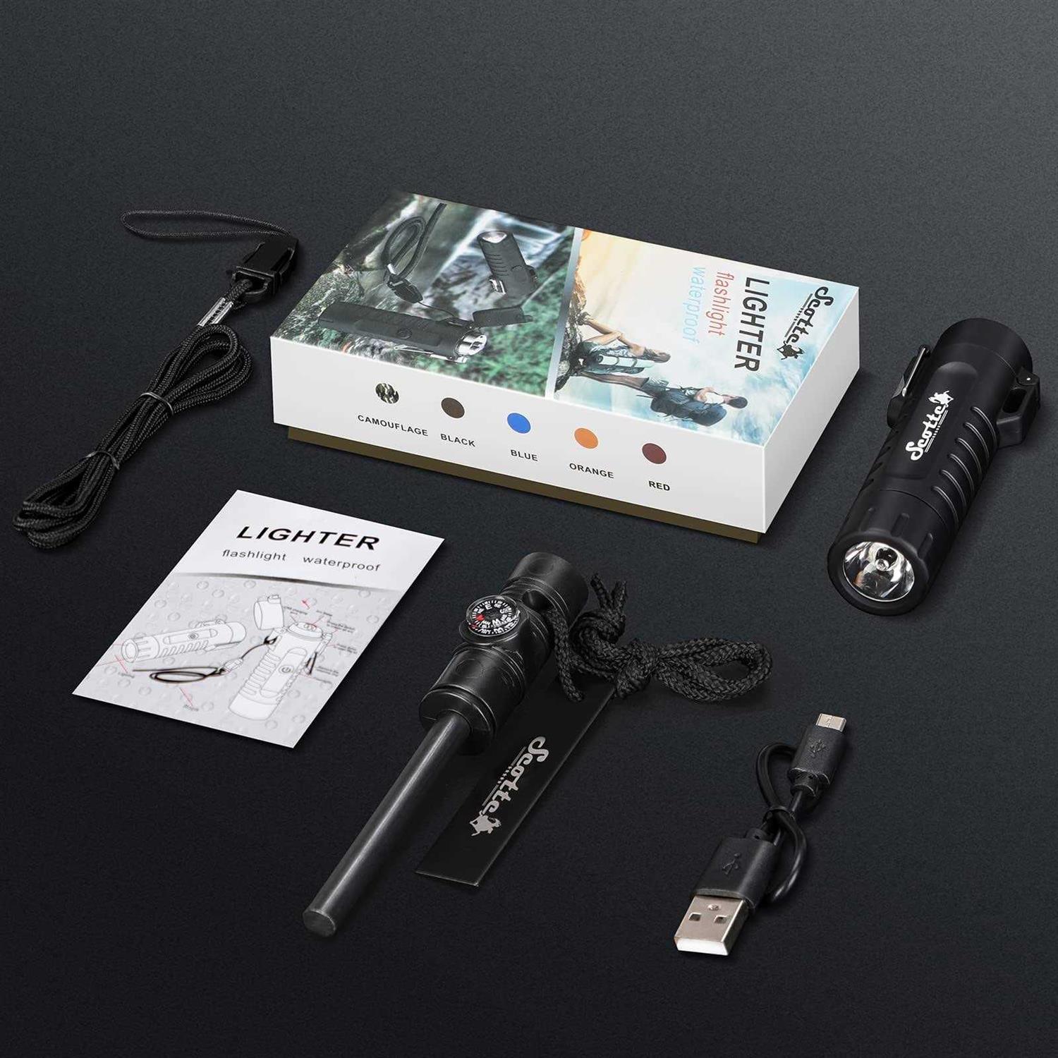 • and 5inch (5-in-1 Magnesium Fire Starter) packaged in a high-end gift box (Product list: one waterproof arcuate lighter flashlight