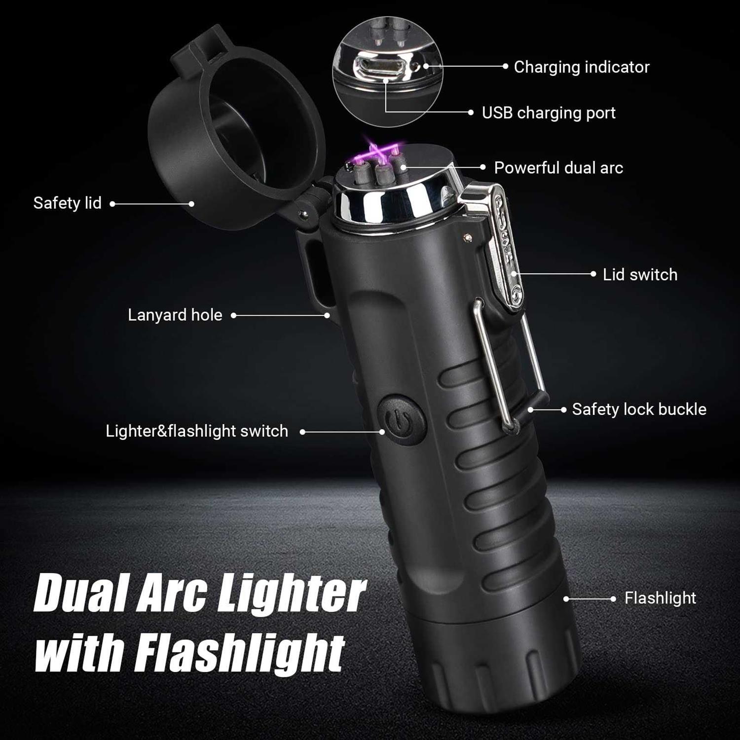 Product Size: 95mm * 40mm * 25mm 53g Packaged In A High-end Gift Box (product List: One Waterproof Arcuate Lighter And Flashlight, One Lanyard, One Gift Box, One Usb Charging Cable)powerful Design Concept:it Is An Excellent Ensemble Combining Twin-arc Lighter And Glare Flashlight, One End Is Designed As A Lighter And The Other End A Flashlight. With It, You Don’t Need To Buy A Lighter And A Flashlight Separately, Which Is Very Suitable For Home, Camping, Travel And Hiking. It Is Also A Perfect Business Gift And A Best Gift For Friends And Parents In Christmas.function Of Lighter: The Lighter Can Quickly Ignite Tobacco Pipe, Cigar, Candlestick And Accomplish All The Work That Needs To Be Done By A Lighter. Can Achieve Fast Charging In Two Hours, And Be Used For 150-300 Times After A Full Charge. Can Be Cut Off Automatically After Fully Charged. No Flames And Windproof During The Use. Pressing The Switch For More Than 7 Seconds Or So Will Activate The Automatic Protection Mode Which Is Being Cut Off Automatically, Making It Safer For You To Use. Worksfunction Of Flashlight:the Flashlight Is Designed To Be Two Modes As Normal Lighting Mode And Flash Mode – To Switch Mode By Pressing The Switch. A Full Charge Can Achieve Continuous Illumination For About 3 To 5 Hours. The Operation Is Simple And Convenient.after-saes Service: There Is Any Problem Or Dissatisfaction With The Product Quality.
