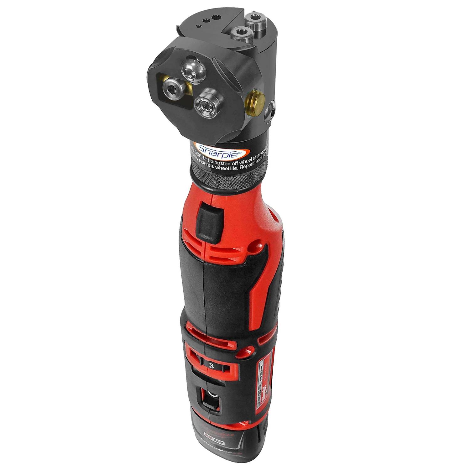 Welding Equipment & Accessories by ARC-ZONE . COM. Details:Cordless Sharpie DX Model Tungsten Grinder. The safe, convenient, and portable tungsten grinding solution. The Sharpie DX is adjustable from 15-45 degrees and the set screw ensures consistent grind angles every time, making it perfect for nearly every TIG welding application. Easily add a tip flat for longer electrode life and reduced weld contamination. Built-in notched cut-off port allows for the removal of contaminated electrode tips. The high-quality Milwuakee M12 cordless motor is adjustable from 5,000-32,000 rpm. This grinder includes collets for 1/16″ (1.6mm), 3/32″ (2.4mm), & 1/8″ (3.2mm) electrodes (.040″ (1.0mm) collet is sold separately), and has the premium medium grit grinding wheel installed (fine grit and coarse grit wheels sold separately).