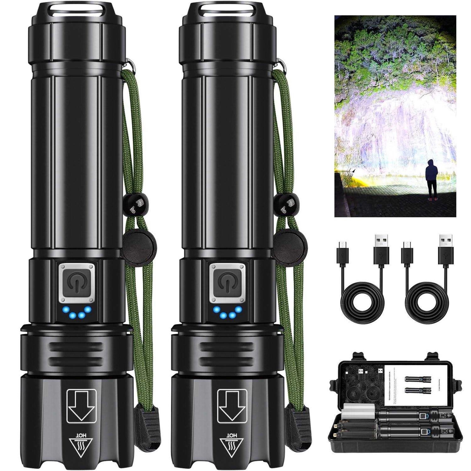 Super Bright 250000 High Lumens The newly upgraded P108 rechargeable flashlight is equipped with a 4-core XHP70.2 chip that improves performance by 60%, it can produce powerful output up to 250,000 lumens,30X times brighter than ordinary Led flashlights.The P108 led flashlight can reach a maximum irradiation distance of 3280 feet, or easily illuminate a wide area of 200 square feet. Brightness is comparable to car lamps so please don’t shoot to eyes directly. USB Rechargeable & Power Indicator This flashlight high lumens is equipped with a 5000MAH high capacity rechargeable ba ttery, providing up to 12 hours of runtime in low mode, and service life can reach to 200,000 hours. Featured with USB- C intelligent charging port, charging speed increased by 30%. The four light indicators on the flashlight help clearly understand the flashlight’ power (25%, 50%, 75%, 100%). It also can be used as a power bank that charges your phone when there is no power IPX6 Waterproof & Wide Uses The led flashlight has a waterproof rubber ring on the charging port as well as on the tail for an IP67 waterproof level for rain, snow or wet environments. Thoughtfully equipped with a holster that can be clipped to your belt or backpack, this emergency tactical flashlight is versatile and suitable for camping, hiking, fishing, running, dog walking, hunting, emergencies, power outages, caves and other complex outdoor environments. Sturdy Aluminum Alloy Material Made of military-grade aluminum alloy, this brightest flashlight is almost indestructible, and the shell strength can withstand a 10-foot drop. The internal structure is exquisite, compact, and firm, ensuring the normal function of the flashlight. The lotus head design can be used as a window-breaking tool in an emergency. It is an indoor and outdoor dual-use flashlight that can meet all needs.. International products have separate terms, are sold from abroad and may differ from local products, including fit, age ratings, and language of product, labeling or instructions. flashlight flash light flashlights high lumens rechargeable flashlights for camping led flashlight home bright flashlight flashlights high lumens rechargeable led flashlights high lumens brightest flashlight rechargeable waterproof flashlight high powered handheld