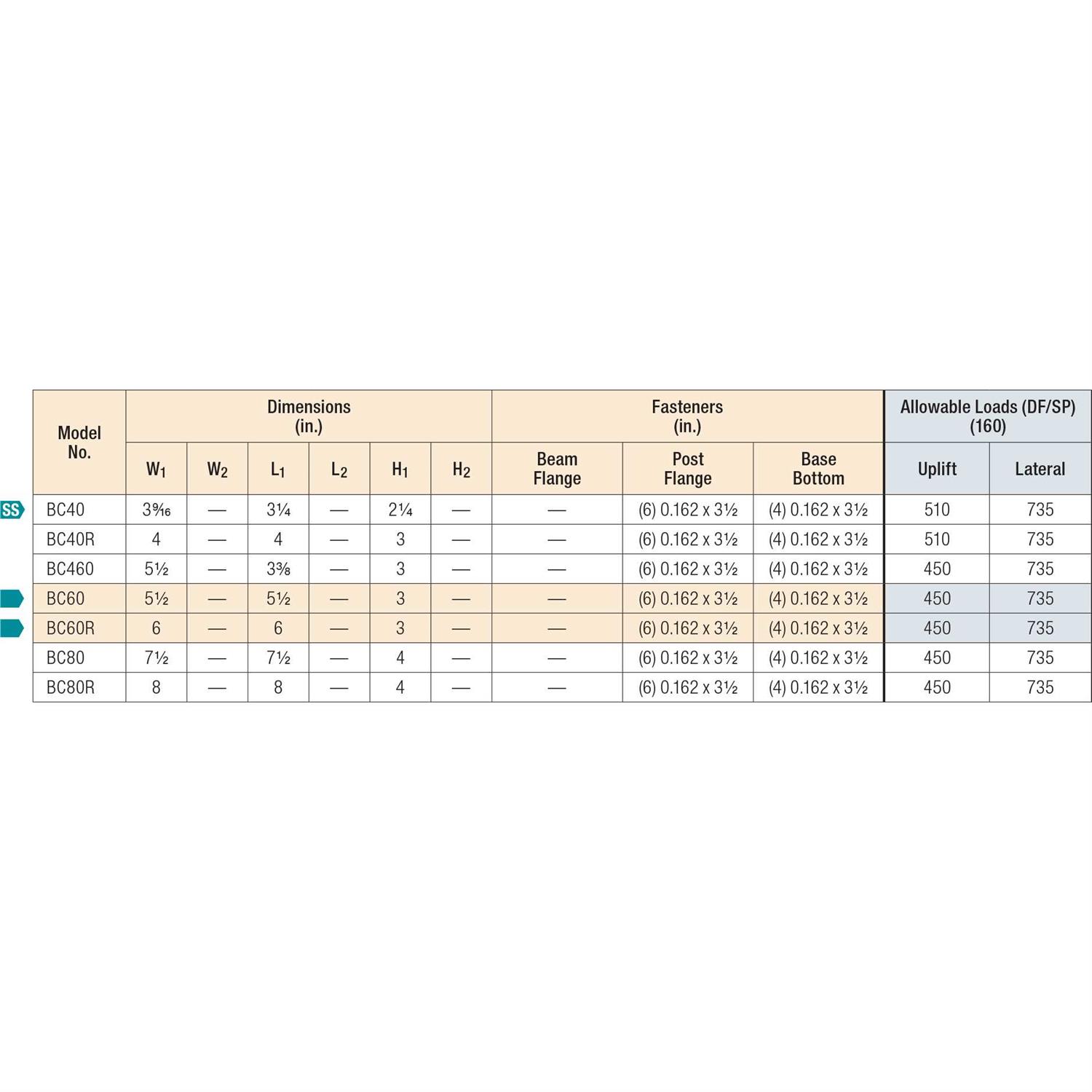 The BC series offers dual-purpose post cap/base for light cap or base connections. Do not install bolts into pilot holes. Install with 16d common nails or 16d x 2-1/2 inch joist hanger nails. Post bases do not provide adequate resistance to prevent members from rotating about the base and are not recommended for non top-supported installations (such as fences or unbraced carports). 18-gauge galvanized steel. Some sizes available with ZMAX coating.