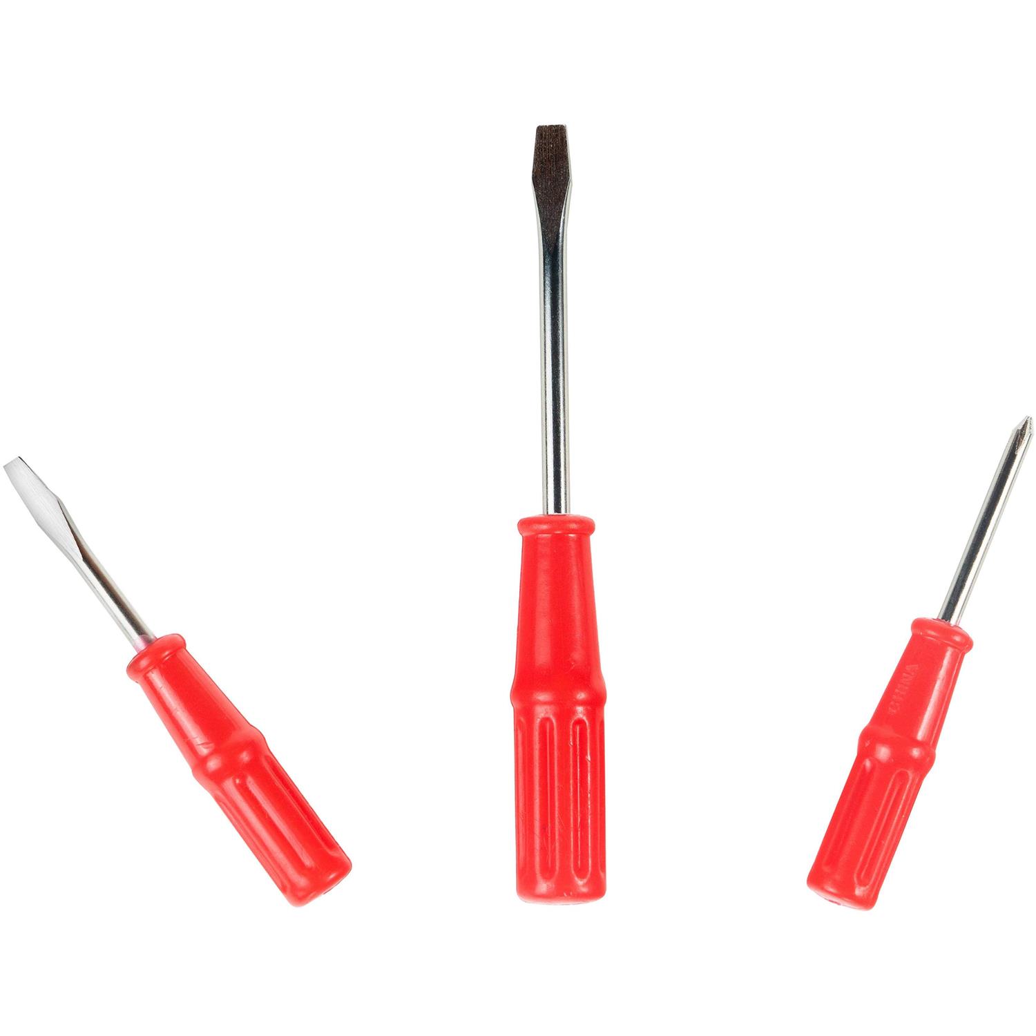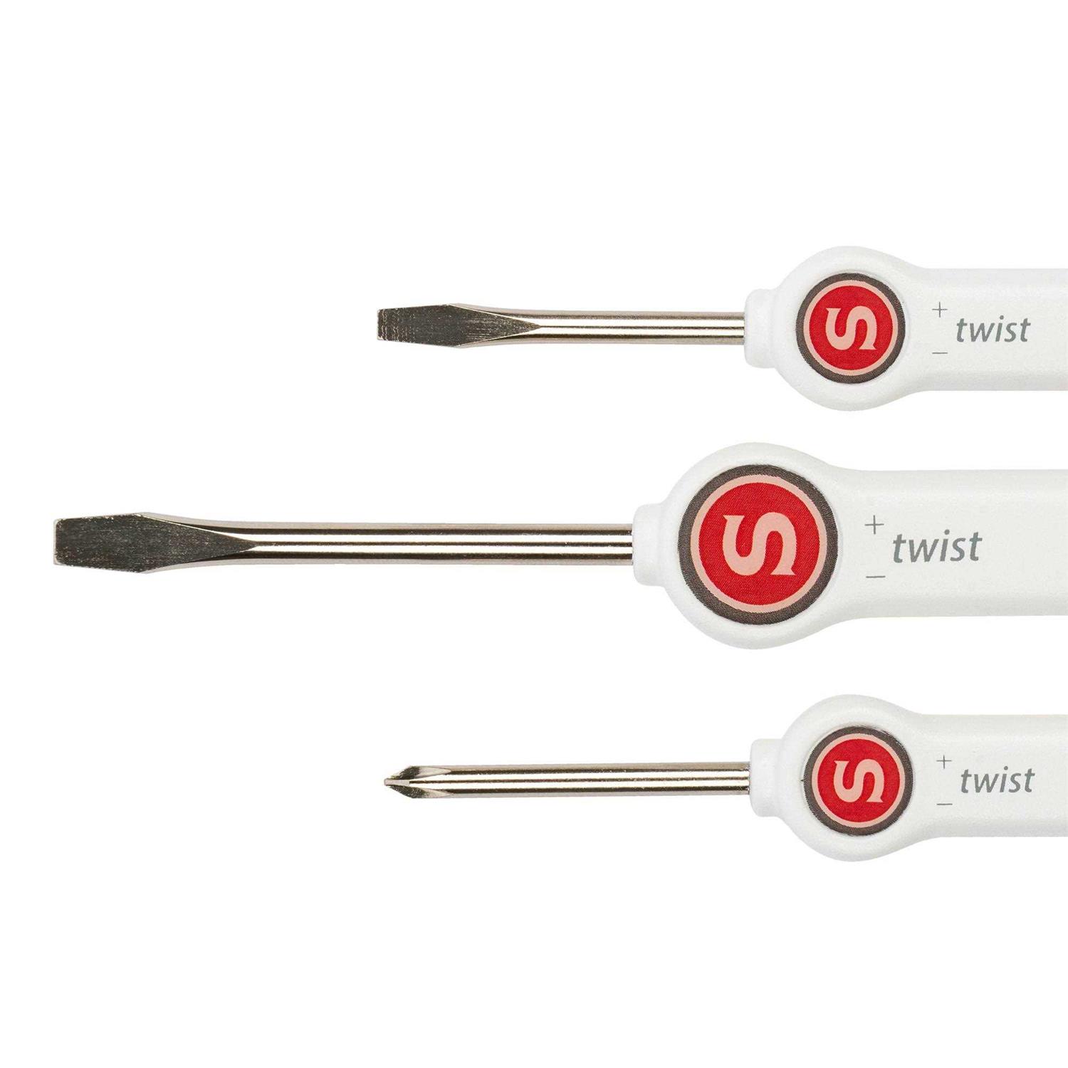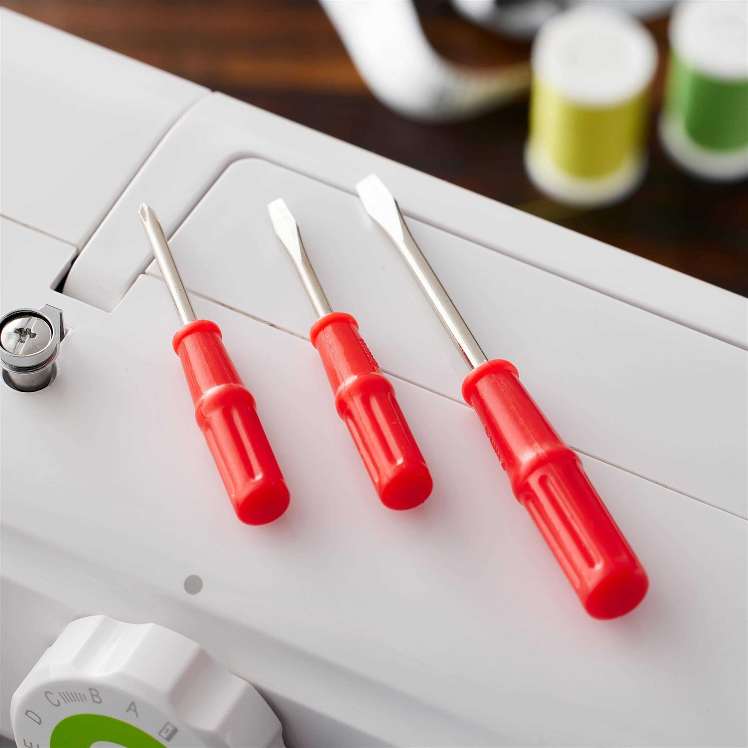 The SINGER 3 Piece Screwdriver Set is a practical set of tools that helps you maintain your sewing machine like a pro. Keep your sewing machine running smoothly and efficiently with periodic tune-ups to tighten parts that loosen with regular wear and tear. This three-piece set of screwdrivers includes one Phillips head screwdriver and two flat head screwdrivers, in larger and smaller sizes. The white plastic handles sport the red SINGER S logo and provide a secure grip. A red ring completes the set to bundle the tools together for easy organization within your tool kit, sewing basket, or sewing machine cabinet. Use these tools for changing needle plates, adjusting bobbin case tensions, or on other small appliances. While the screwdrivers are designed for the types of screws commonly found on most sewing machines, this handy and versatile set of tools can be used to tighten and loosen screws on other types of small appliances as well. This set is sure to be a useful and practical addition to any tool kit. The compact size makes it easy to get to hard to reach screws and are perfect for storing in a sewing basket.