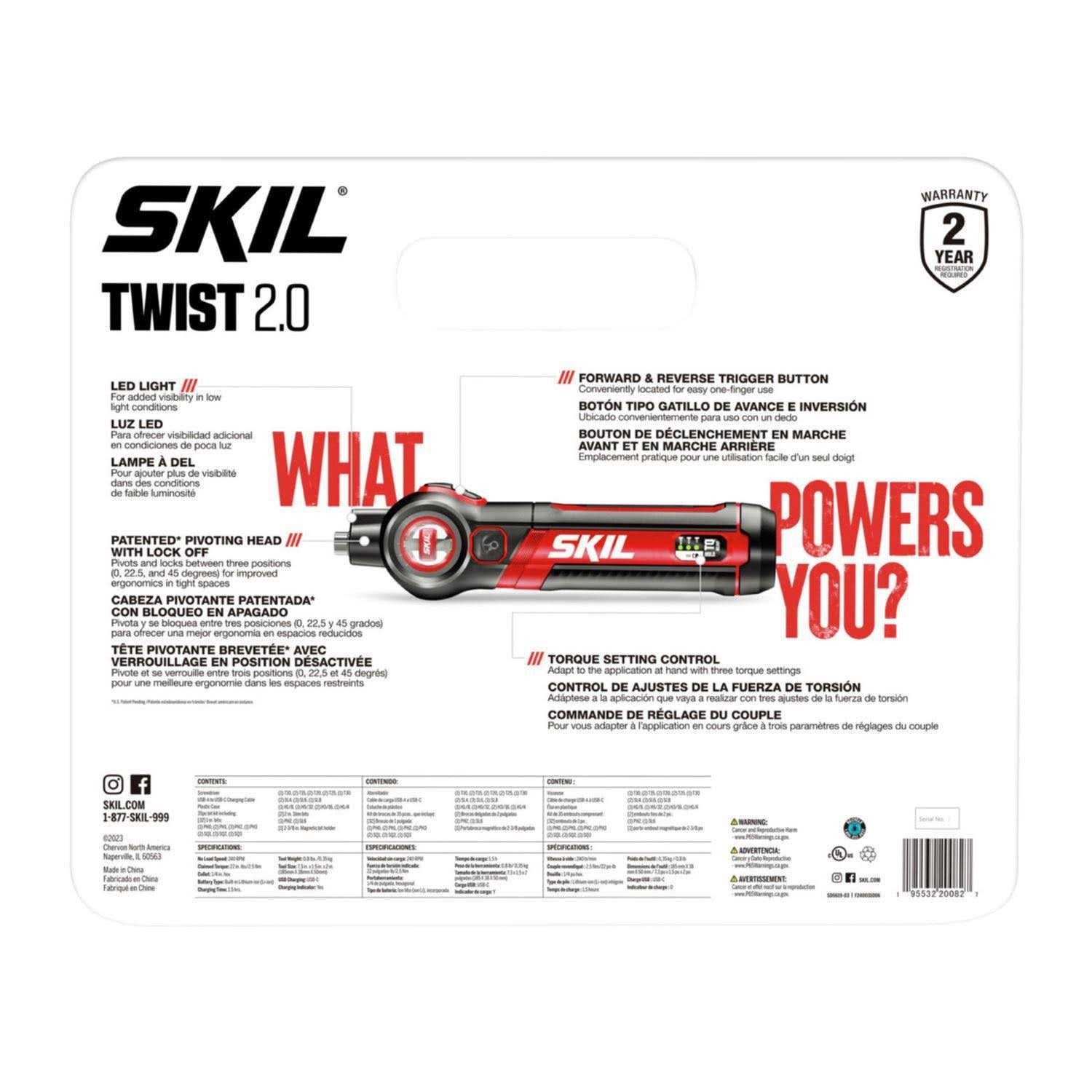 This ergonomic electric screwdriver features a patent-pending pivoting head that locks between three positions0, 22.5, and 45 degreesfor improved comfort in tight spaces. It features three torque settings that allow you to adapt to the application at hand. Its trigger button is conveniently located for easy one-finger use, and its bright LED lights up dark spaces. The cordless screwdrivers integrated battery features a USB-C charging port with included cable for convenient recharging.
