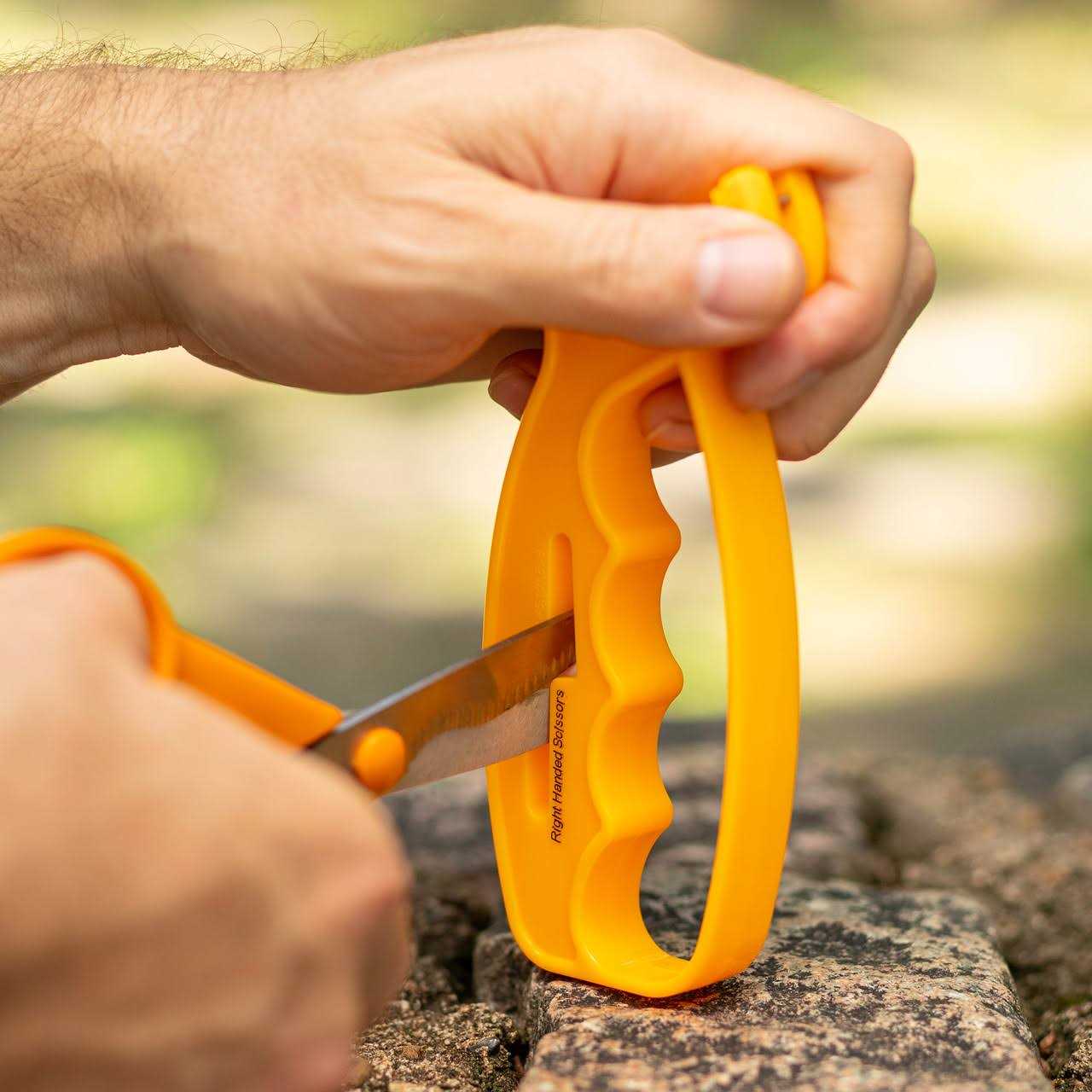 Smith’s 10-Second Knife and Scissors Sharpener features a V shaped knife sharpening slot with two crossed carbide blades. The carbide blades allow you to put a quick edge on your knife with just three or four strokes, and are preset at a fixed sharpening angle for guaranteed results every time. They are also reversible and replaceable. The patented scissors sharpener included in the handle of the 10-Second Knife and Scissors Sharpener features a specially designed FLOATING round ceramic rod, which conforms to the exact angle of your scissors every time. It works on both left and right-handed scissors. Just three or four strokes is all it takes to put the edge back on your scissors.