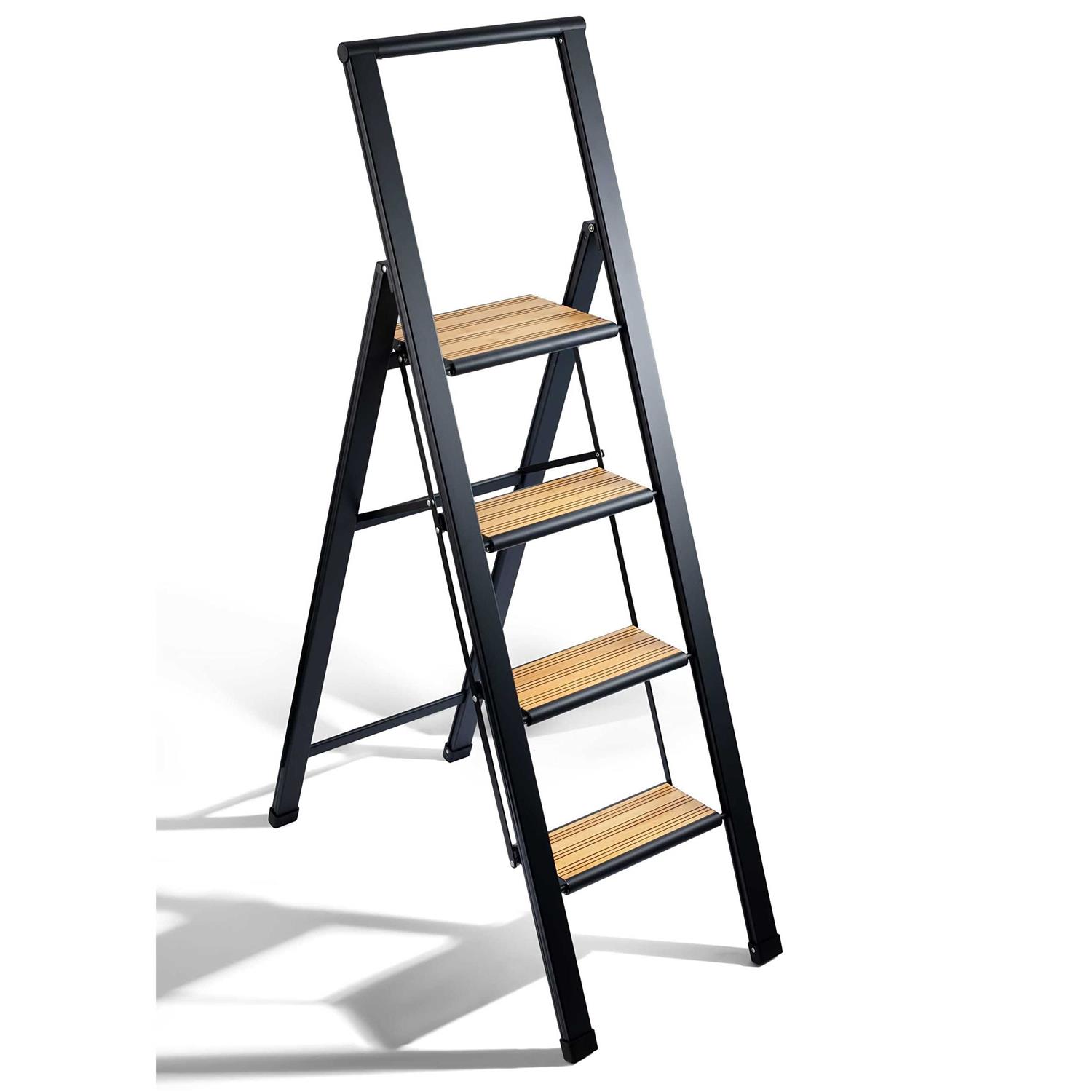 Sorfey Premium 4 Step Modern Bamboo Ladder. Lightweight, Ultra Slim Profile, Anti Slip Steps, Sturdy-Portable for Home, Office, Kitchen, Photography