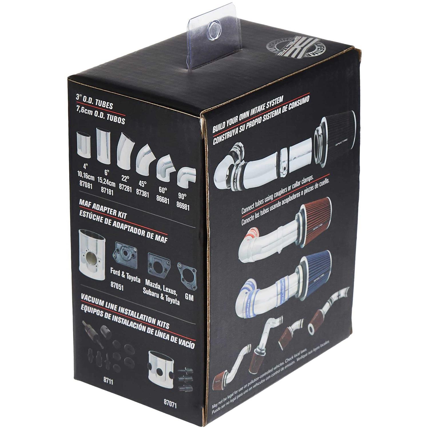 Spectre’s 3 inch Chrome Intake Tube with 90 degree elbow is manufactured from durable co-polymer ABS resin that insulates the intake tract from heat. This intake tube can be combined with other 3 inch chrome tubes to create an intake for almost any application. Use with coupling collar P/N 8706 or with standard flexible couplers. This part is not for turbo-charged or super charged engines. Spectre s 3 inch outside diameter 90 degree bent air intake tube elbow is manufactured from durable co-polymer ABS resin that can help insulate the intake tract from heat.