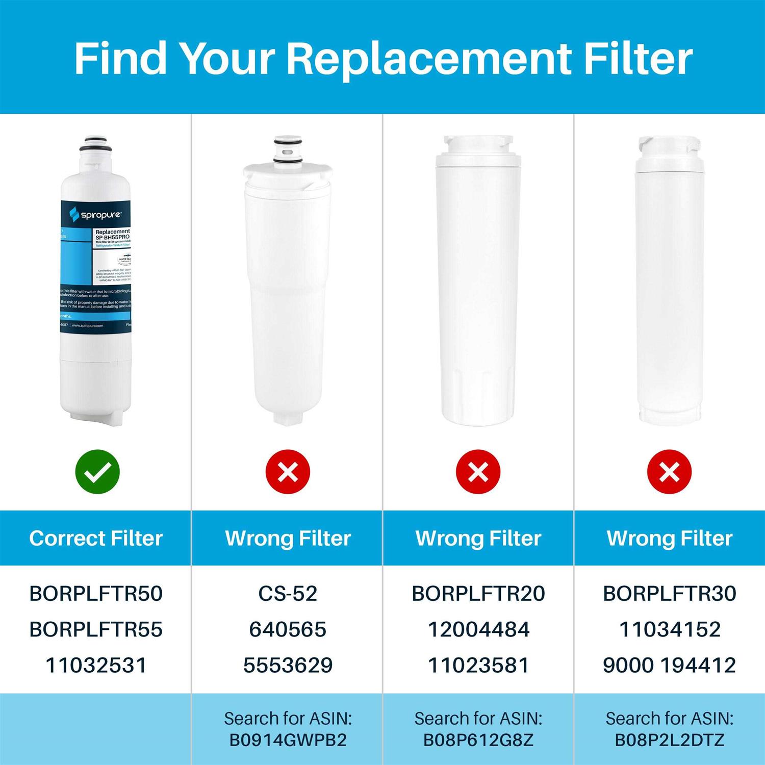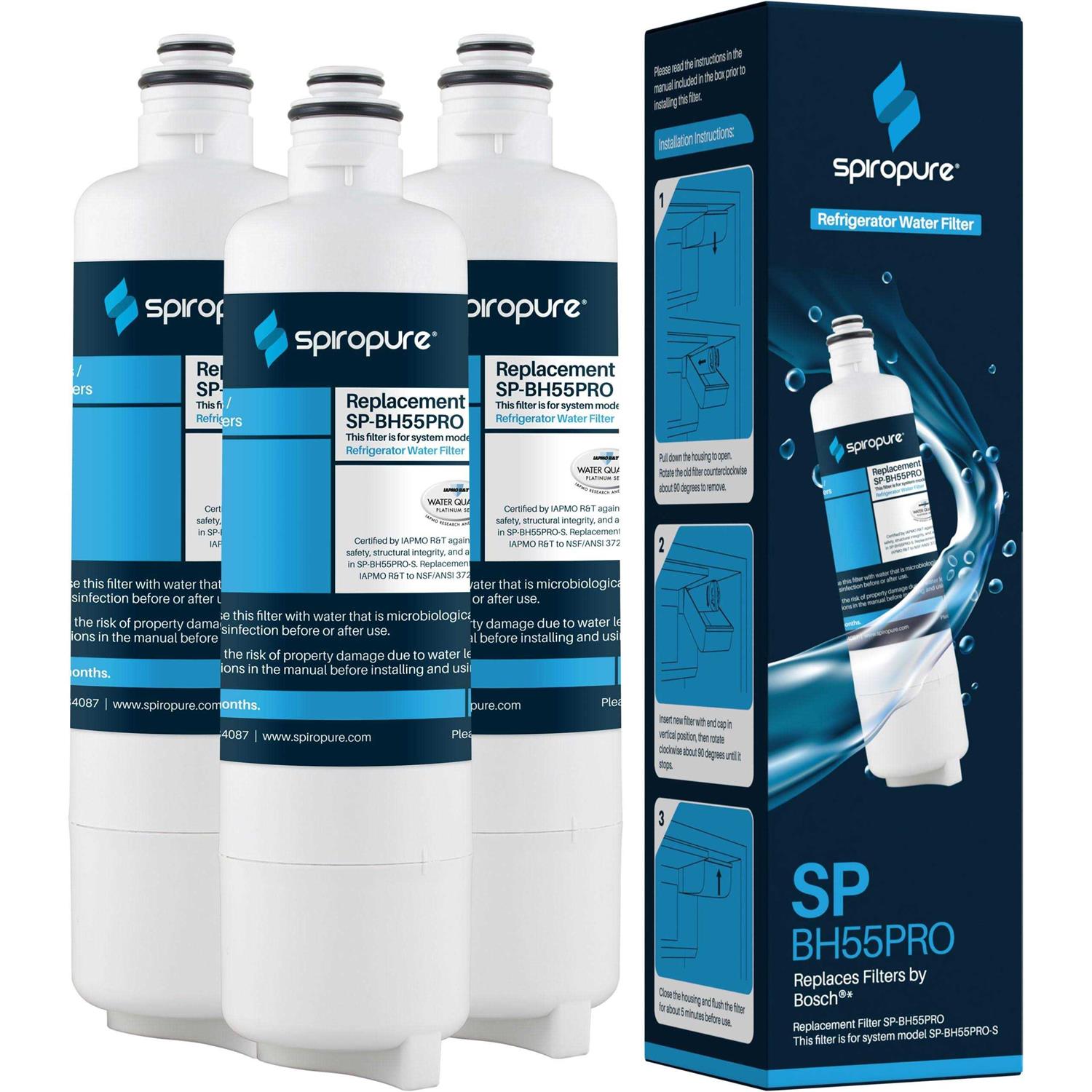 Water Filters by SpiroPure. Details:The SpiroPure SP-BH55PRO NSF-Certified Refrigerator Water Filter is a high quality alternative fridge filter for any refrigerator that currently uses the Bosch BORPLFTR50 or BORPLFTR55 refrigerator filters. Food grade, BPA-free, NSF 42 and 372 certified filters utilize premium coconut shell carbon for better tasting, smelling, healthier water from your fridge.
