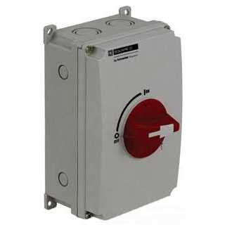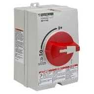 MD Enclosed disconnect switch has three poles that are rated at 30 A. Contacts are also rated for 7.5 HP at 240 VAC. The switch is operated using a rotary handle.