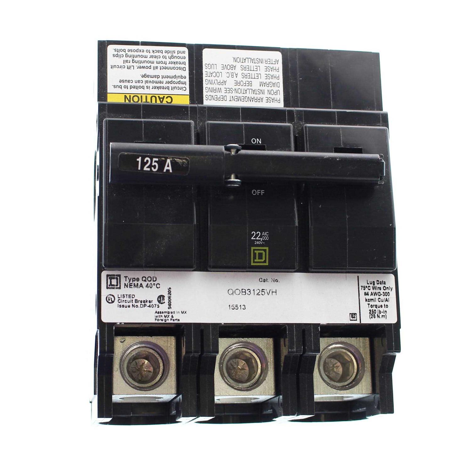 Schneider Electric/Square D Miniature circuit breaker with Visi-Trip indicator has box-type lugs to accommodate 4 AWG – 300 Kcmil copper and aluminum wires. The 3-Pole circuit breaker has voltage rating of 240 VAC, current rating of 125 Amps and short-circuit current rating of 22 kilo-Amps. Miniature circuit breaker has six-spaces and mounting bolts to hold the breaker in place. It measures 4.500 Inch x 4.900 Inch x 5.720 Inch. Standard size circuit breaker is ideally designed to offer superior overload and short circuit protection. It is an ideal choice for NQOD panel-boards. Miniature circuit breaker is UL listed and CSA certified.