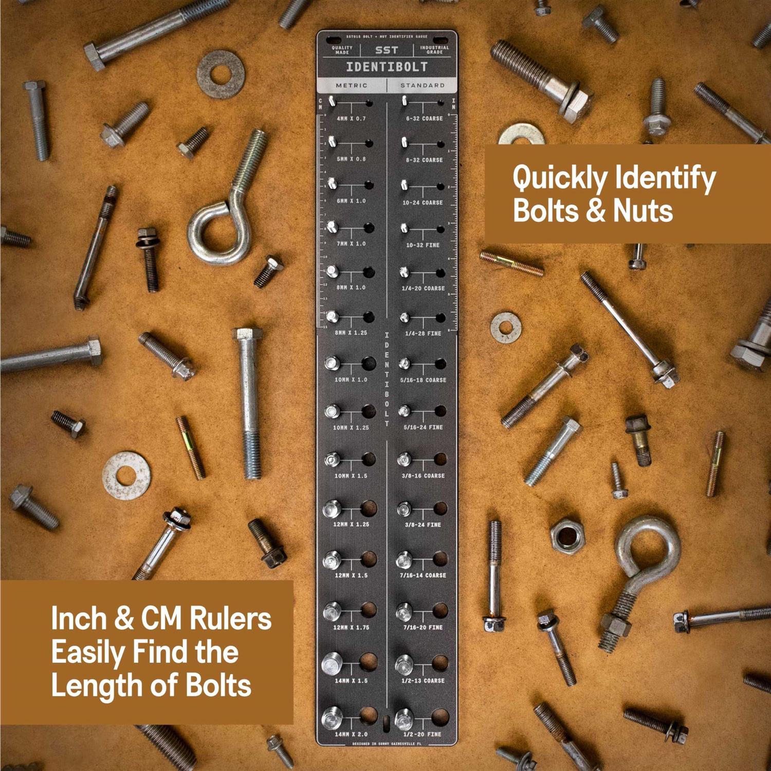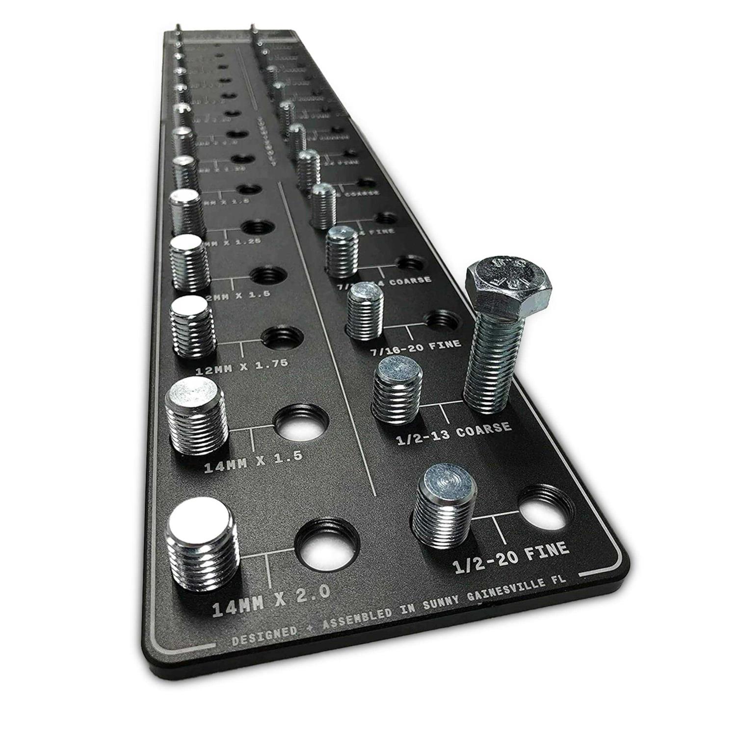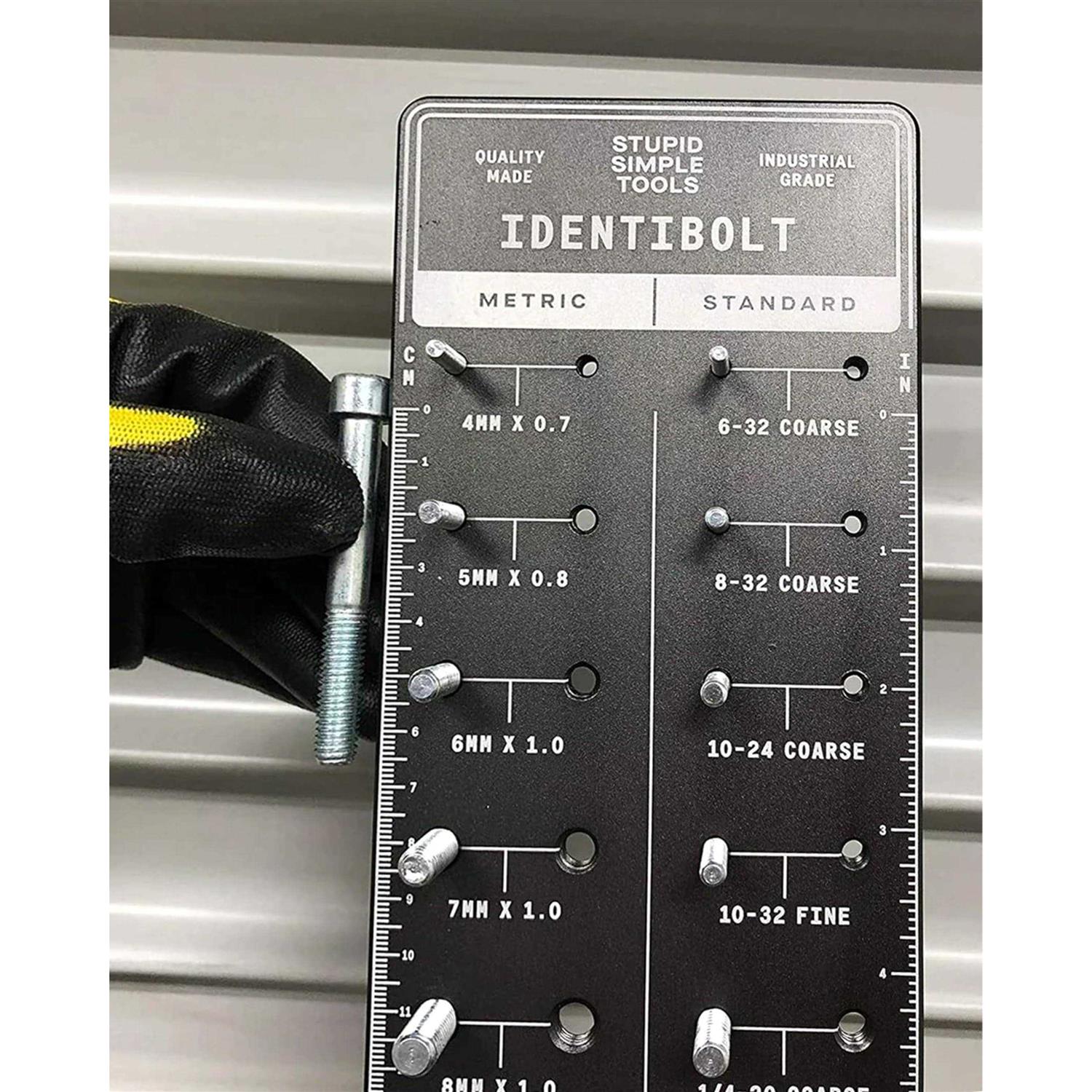 The ULTIMATE Nut and Bolt Identification Tool. Measure from 4mm & #6 up to 14mm and 1/2″ threads. CNC Machined from 6061 Aluminum with a Protective Anodized Finish. Laser etched markings wont fade or get scratched off. Measures 4″ wide x 20″ tall.,,Stupid Simple Tools