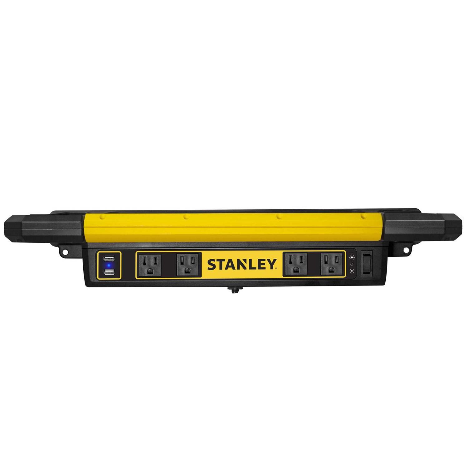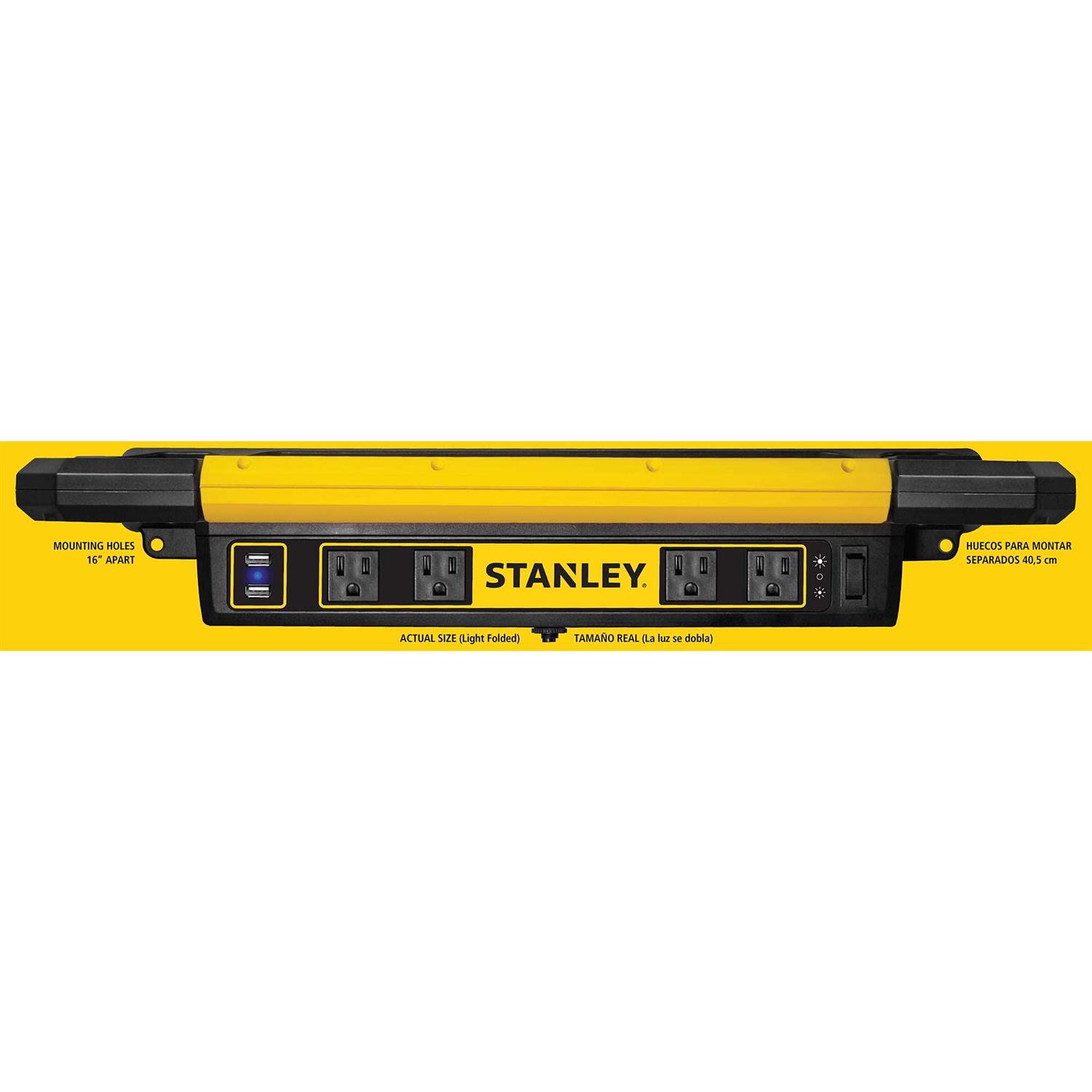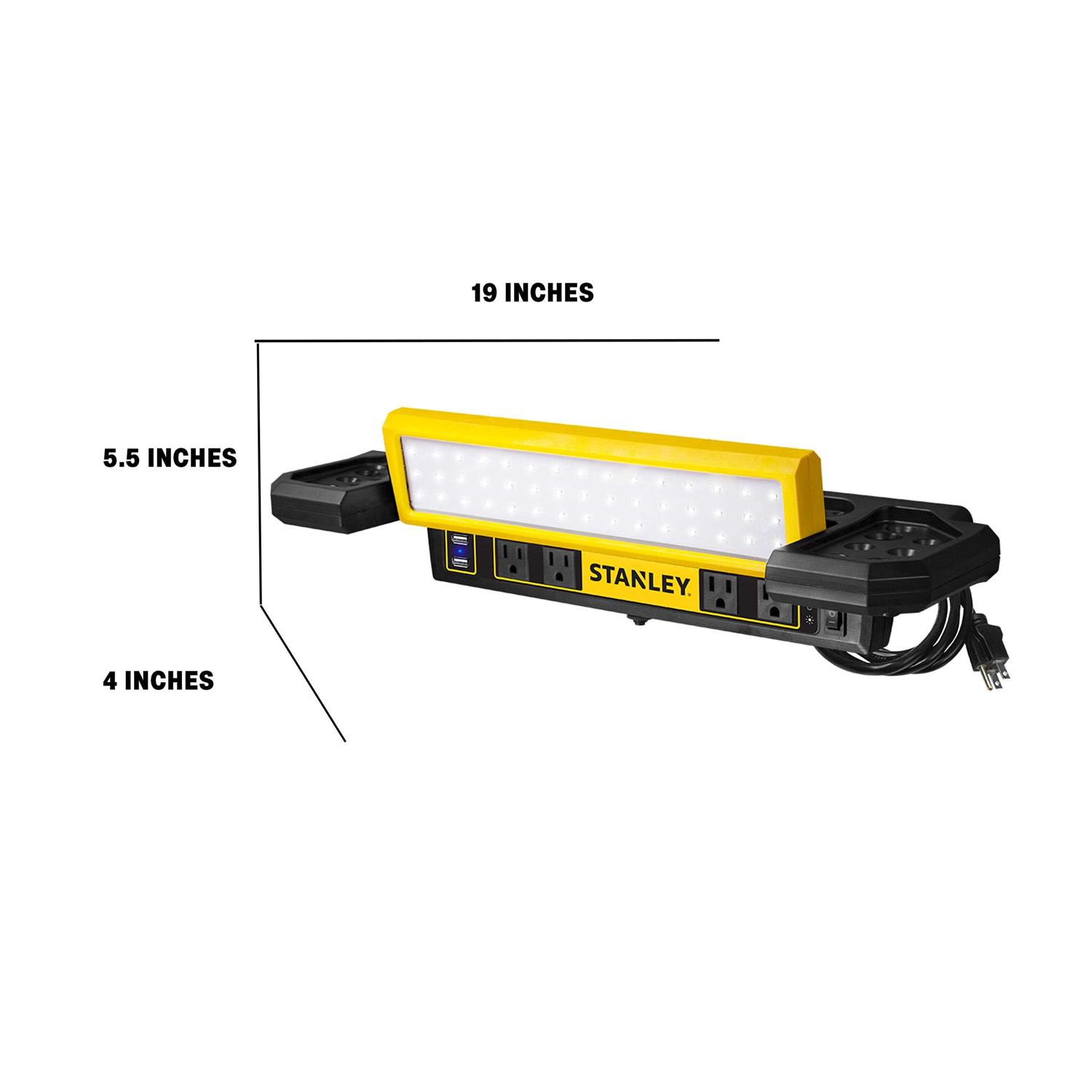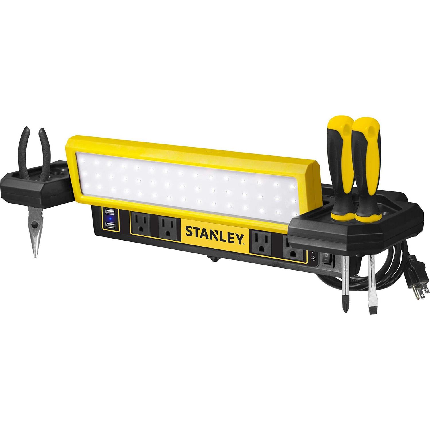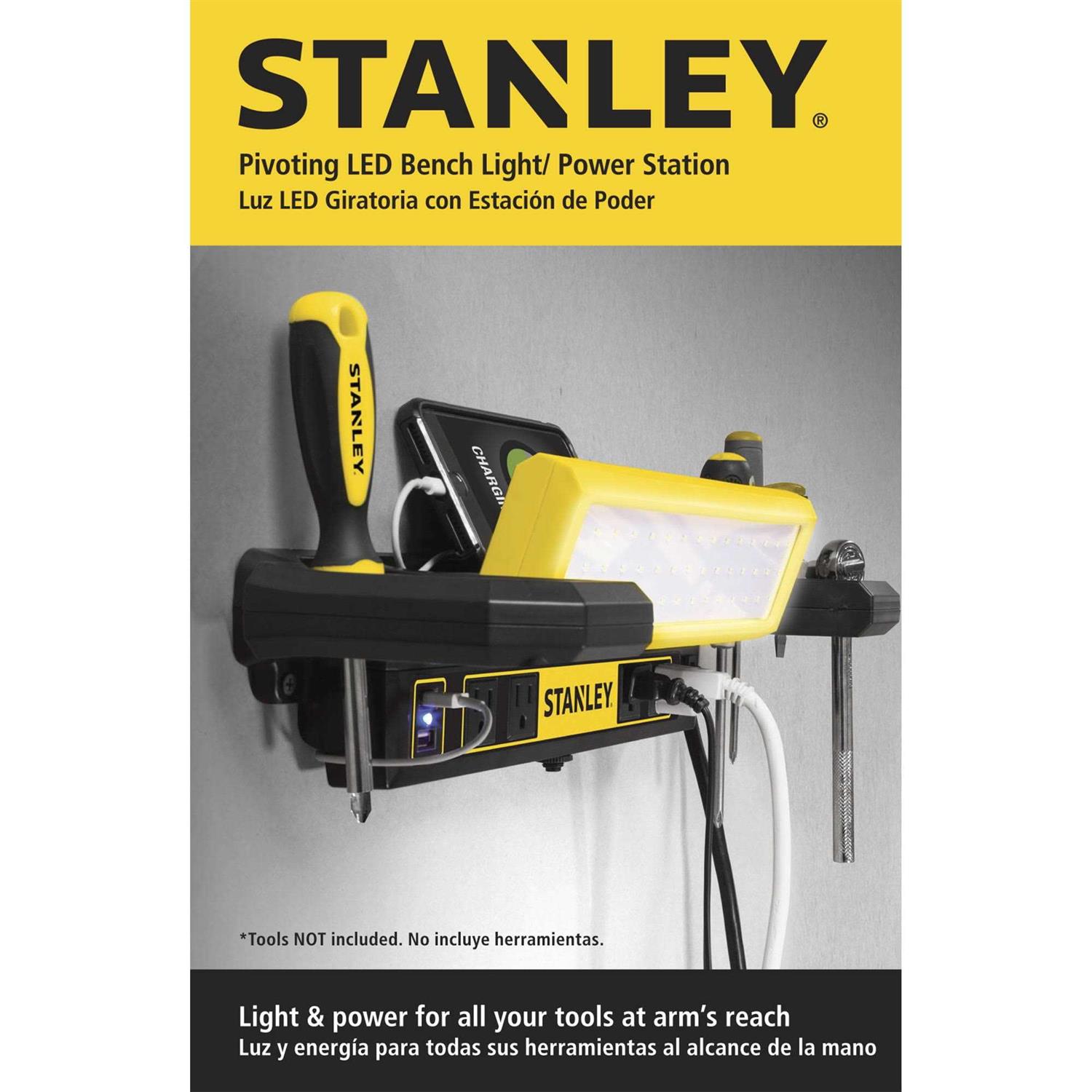 Keep your workspace organized, powered up and well-lit with the STANLEY PSL1000S work light with power station. It features 45 ultra bright LEDs that provide up to 1000 lumens of light to make sure your workspace is well lit. The pivoting panel allows for easy positioning and adjustment of the light beam, with modes for high, low and off. The Power Station offers two USB charging ports plus four household 120V AC outlets. Not only does this unit keep you well lit and powered up, it also keeps you organized with a tool holder and storage tray. 6ft. electric cord.