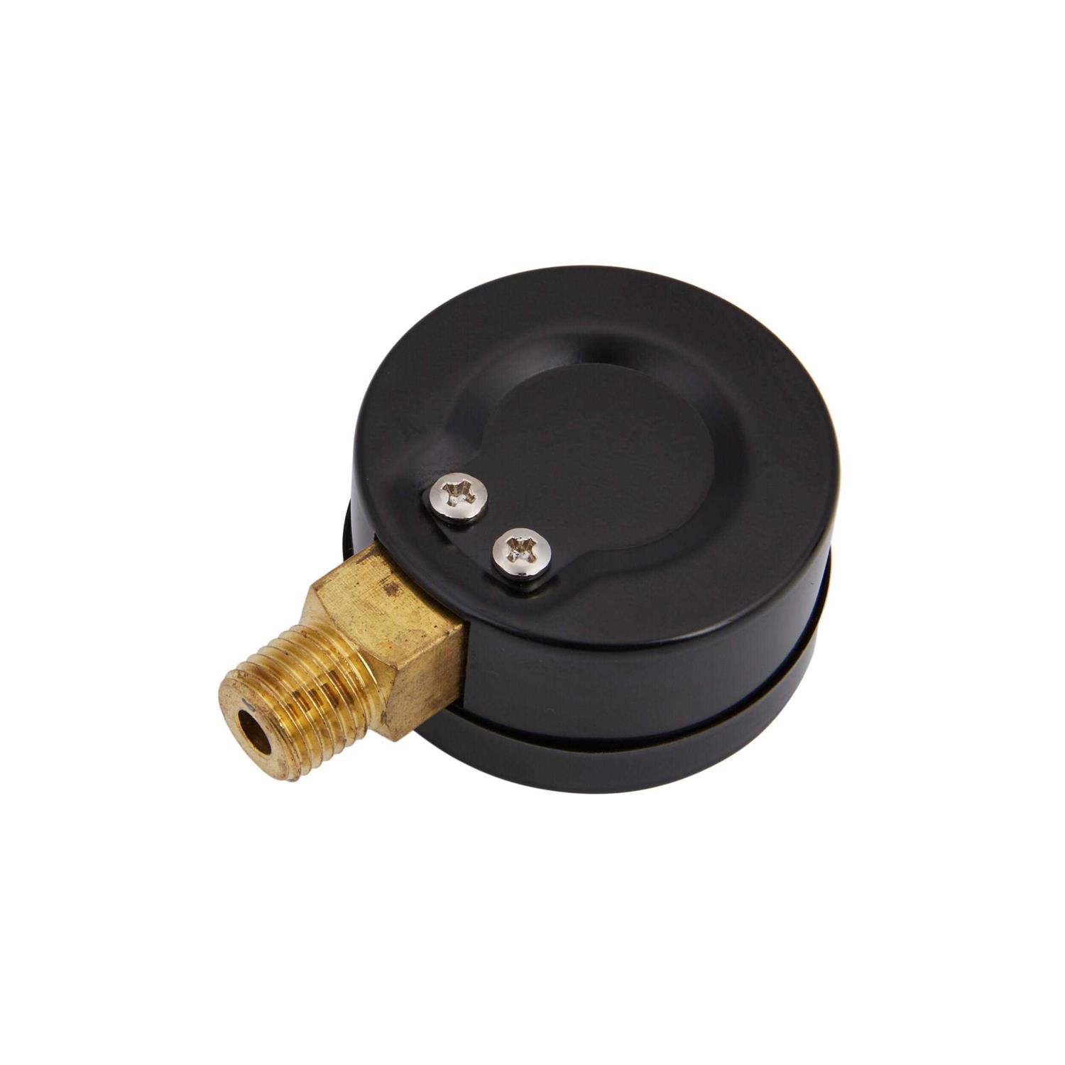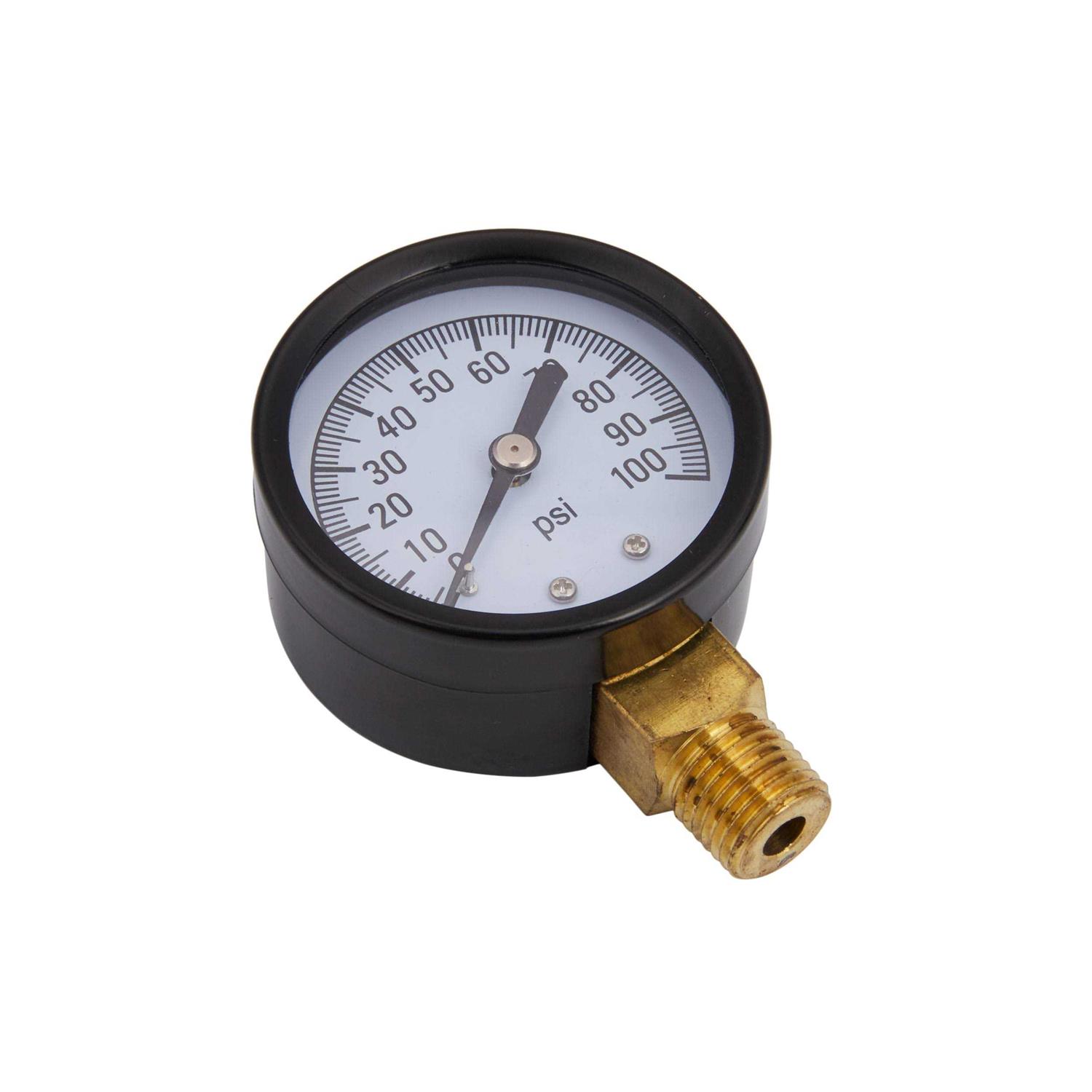 - This pressure gauge measures water pressure in the well system. It has a 1/4-in lower mount brass connection. It is for use for systems up to 100 psi.