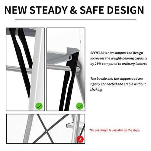 User Experience When you are cleaning hard-to-reach areas, Using EFFIELER step ladders at home is your best choice, which will make you easy to use, When folded, the ladder makes it look small and easy to store, Our foldable two-step ladder is an ideal tool for completing any task in various places such as the kitchen, study, bathroom, and garage The ladder can be used in high cabinets to replace light bulbs or clean windows, thereby providing a comfortable working environment and making it easier to complete the work.